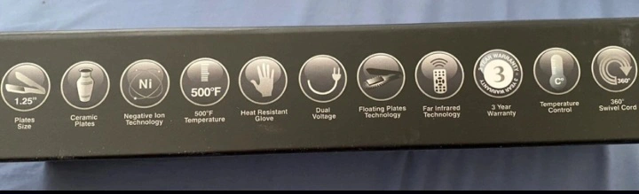 Ceramic plates, negative ion technology. 1.25" plates. 500°F temperature. Dual voltage. Far infrared technology. 360° swivel cord. Heat resistant glove included.