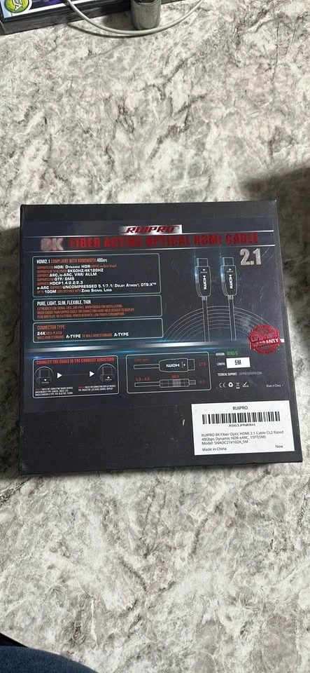 8K HDMI Fiber Optic Cable CL2 Rated 15 Feet. Supports 48Gbps, 8K60Hz, 4K120Hz, Dynamic HDR, eARC, HDCP2.2/2.3. Great for RTX4080/4090/3080/3090, Xbox S/X, PS5/4, AVR, Projector, and LG/Samsung/Sony TVs. Let me know if you're interested!