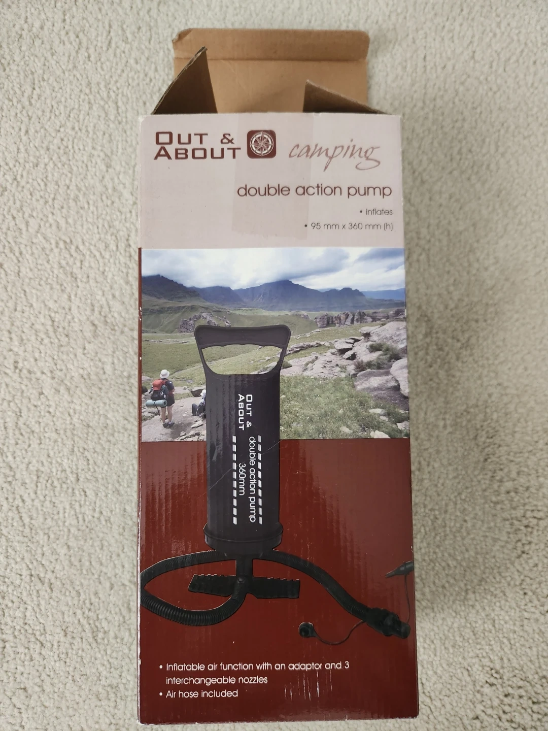 Exercise ball and a double action pump. It inflates quickly with its double action design. It comes with an air hose and 3 interchangeable nozzles.