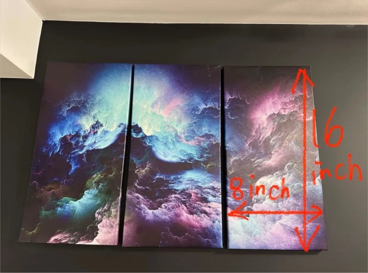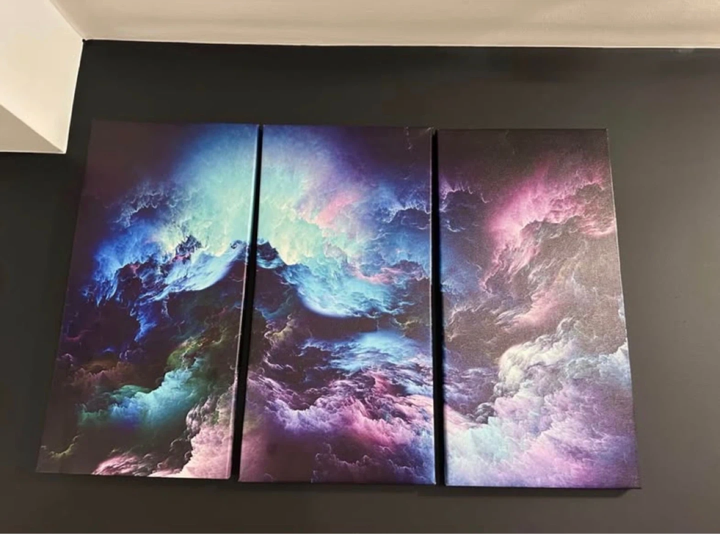 This set of three canvas prints depicts a vibrant nebula with swirling blues, purples, and pinks. Each print measures approximately 16 inches tall by 8 inches wide. It's a striking piece for any room!