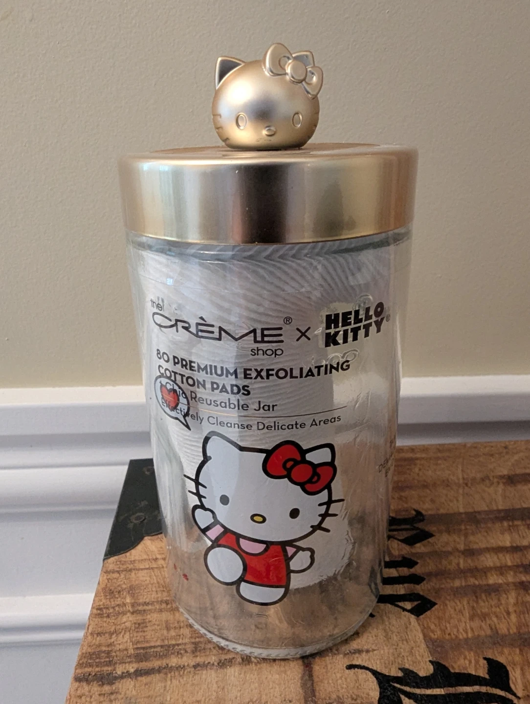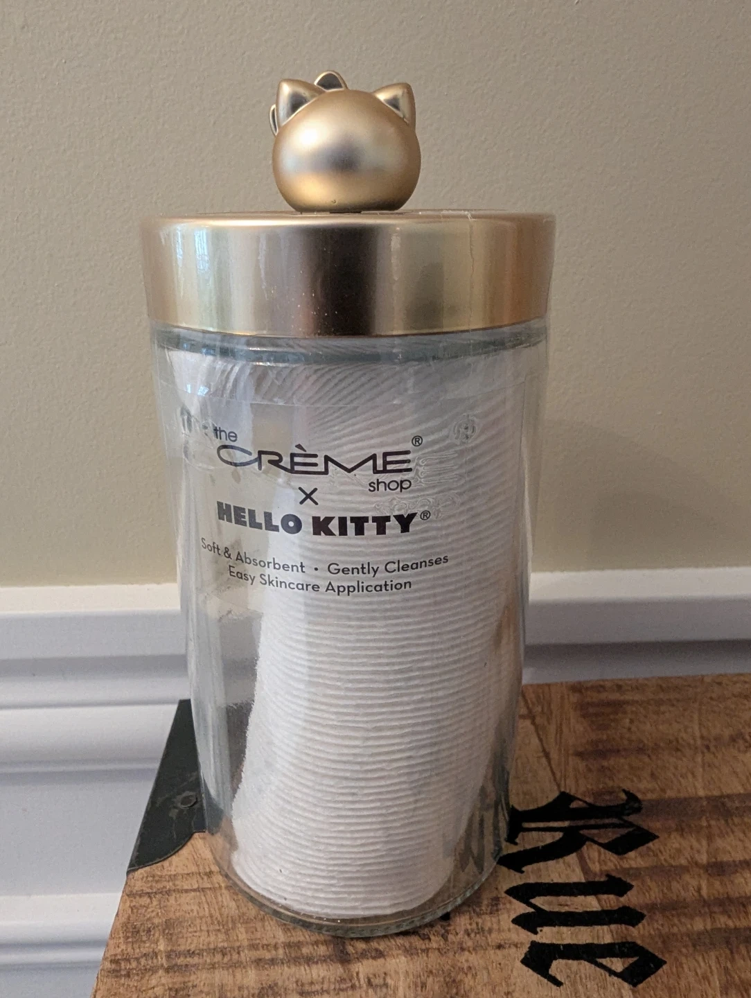 This set includes 80 premium exfoliating cotton pads in a reusable jar. They're soft, absorbent, and designed for gentle cleansing of delicate areas. The Hello Kitty themed jar adds a cute touch to your skincare routine!