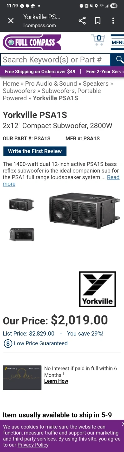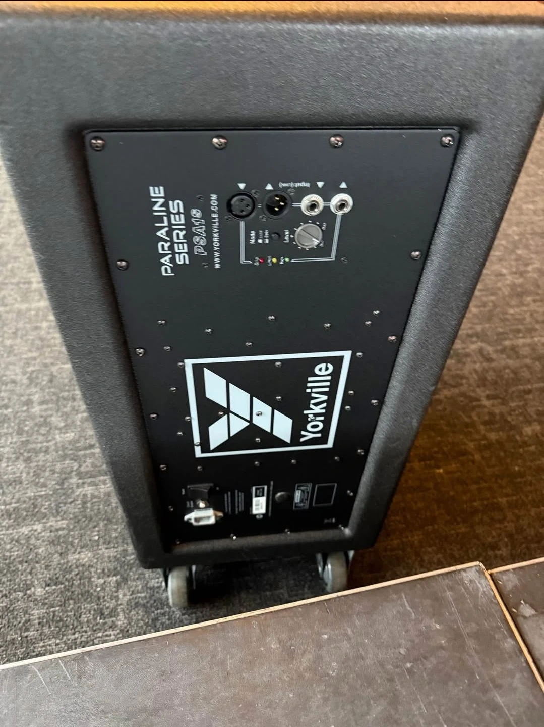 This is a Yorkville PSA1S Paraline Series 12" active bass reflex subwoofer. It's a dual 12-inch unit designed as an ideal companion for PSA1 full range loudspeaker systems. It's active and powered.