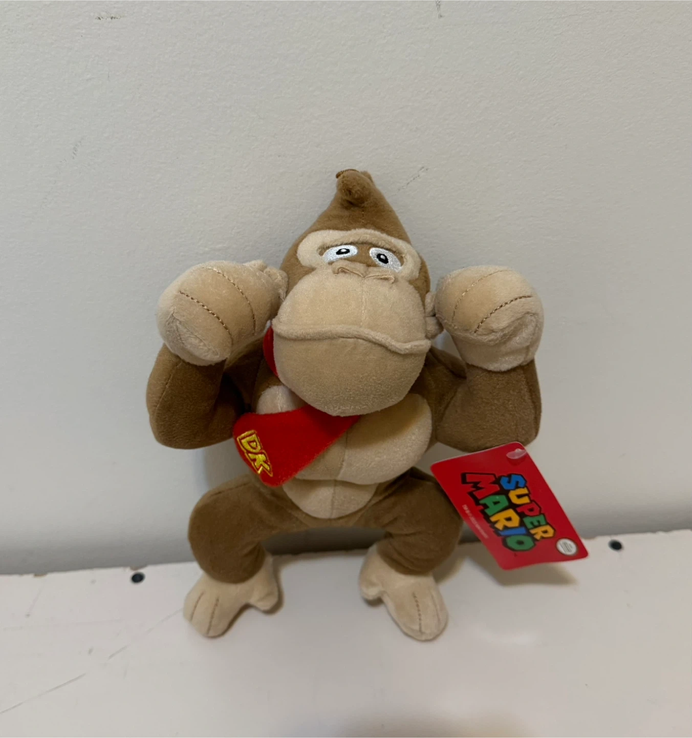 This is a Donkey Kong plush toy from the Super Mario franchise. It's made of soft plush material. The tag reads 'Super Mario' and 'DK'.