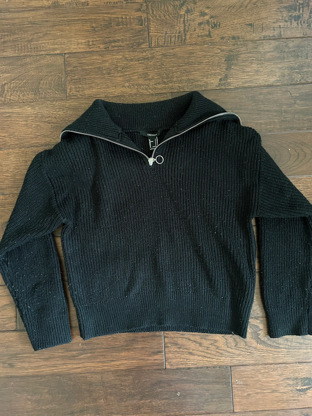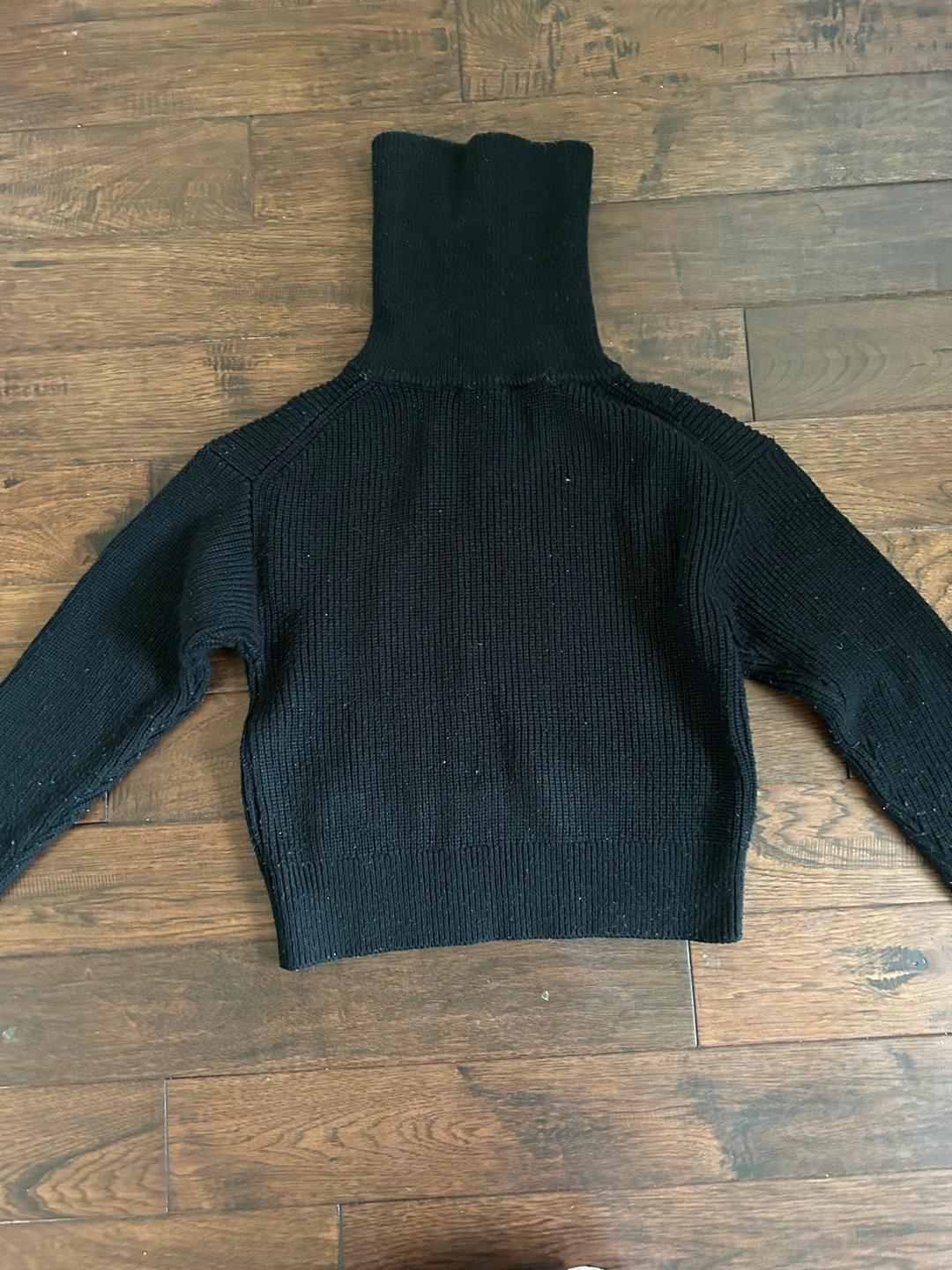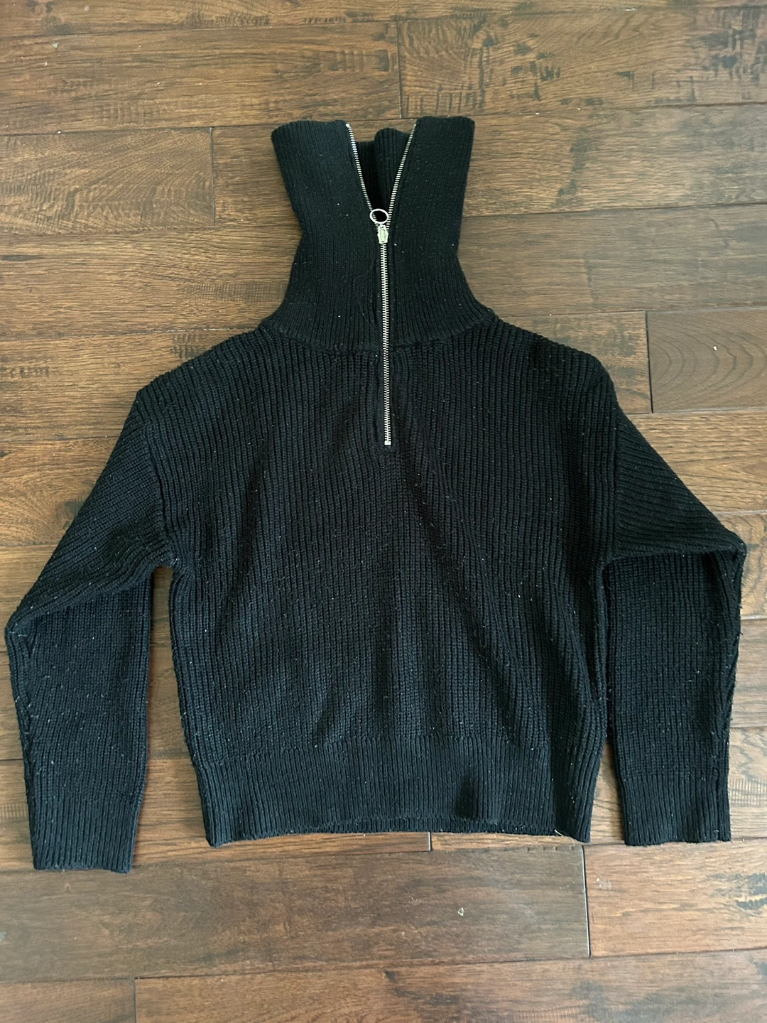 Black sweater with adjustable turtleneck. The sweater is a ribbed knit and has long sleeves.