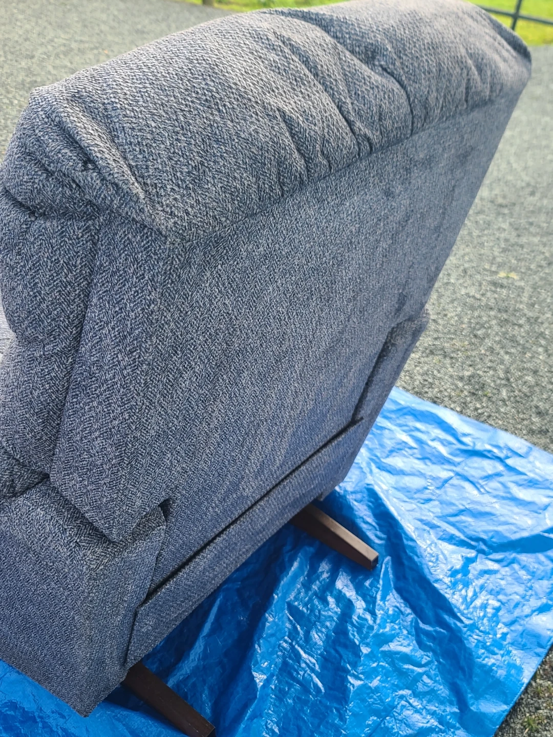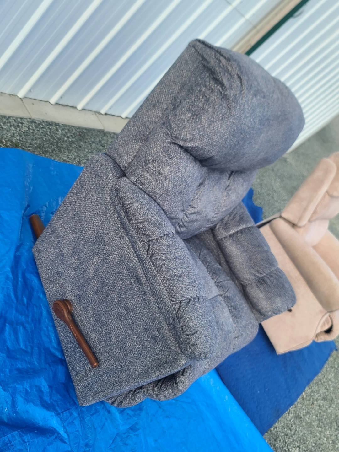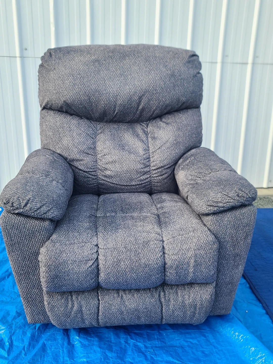Comfortable La-Z-Boy grey fabric recliner armchair in good condition. Features a smooth manual reclining mechanism with side handle, plush padded seat, high back, and wide armrests for excellent support. Measurements: W 35" X D 28" X H 39". Delivery can be arranged. Viewing and pickup by appointment.