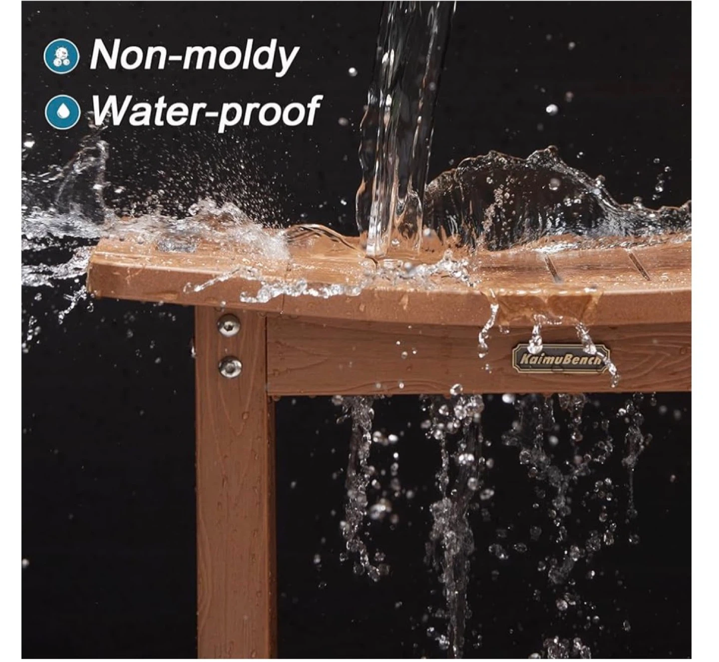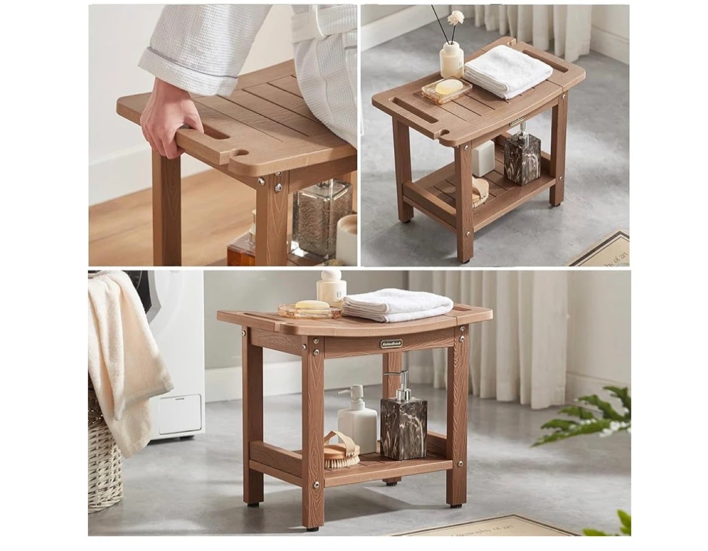 Kaimu Beach shower bench seat in a wood-look finish. It's non-moldy and waterproof. Dimensions are 21" L x 12.6" W x 17.5" H. Supports up to 550 lbs.