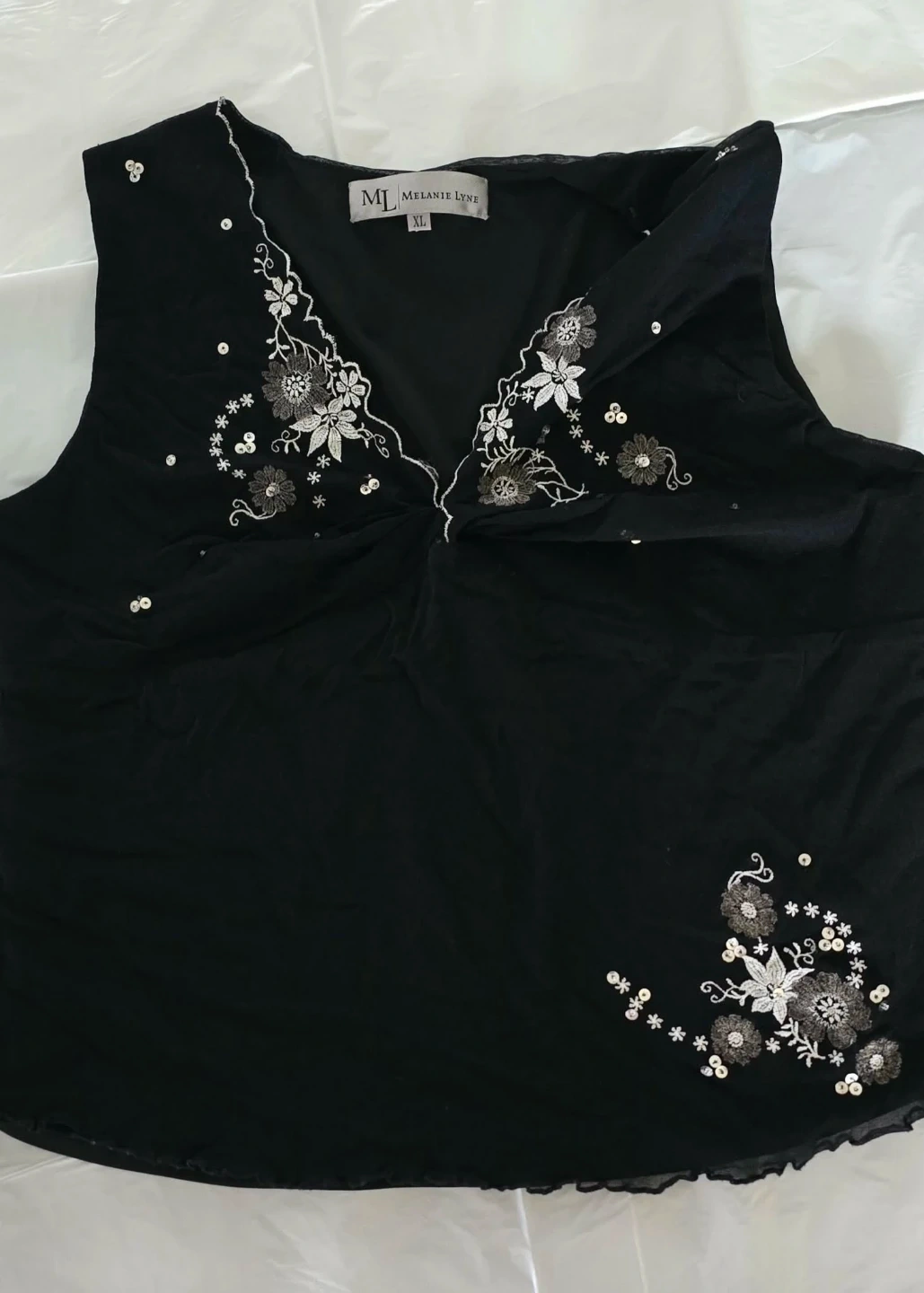 Sleeveless black top from Melanie Lyne. Features floral embroidery and sequin details. Size XL. Sheer overlay with lettuce hem. Fits like a large.