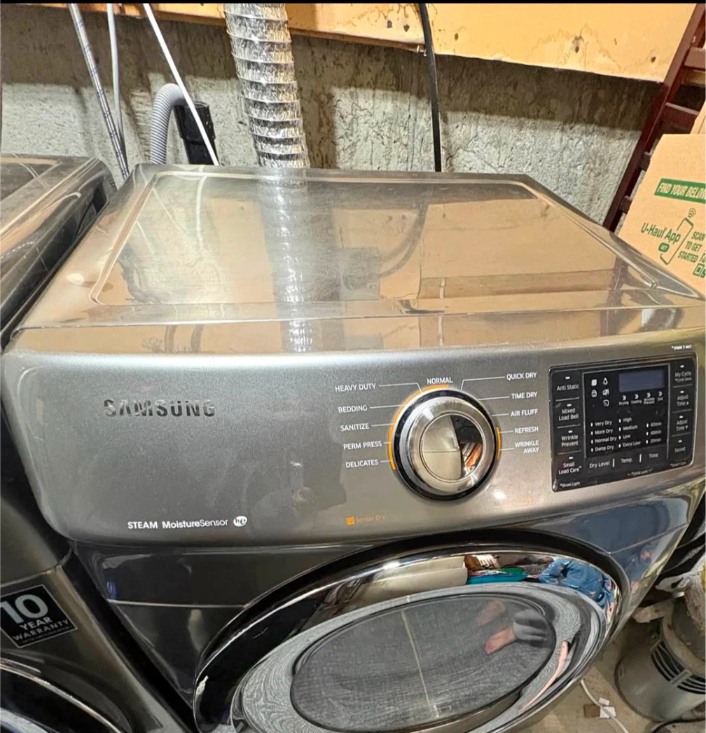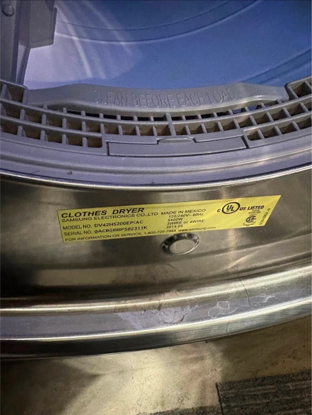 Selling a Samsung clothes dryer, model number DV42H5200EP/AC. It's in good working condition and ready for a new home. This dryer was made in Mexico and requires 120V/240V and 3400W with a 30 AMP circuit or 4 wire connection. It also features steam moisture sensor.
