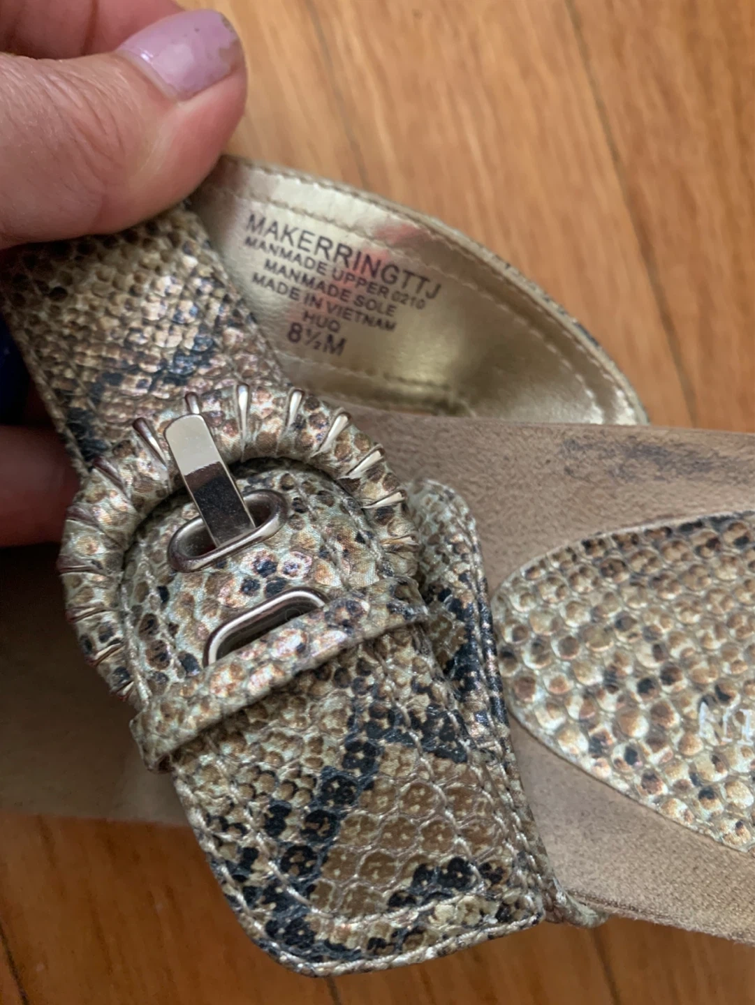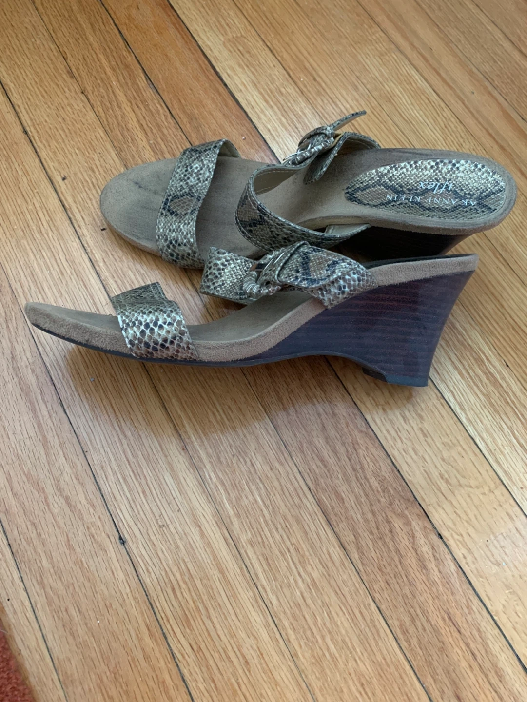 These Anne Klein wedge sandals feature a snakeskin pattern and buckle detail. The man-made upper and sole ensure durability. Made in Vietnam. Perfect for dressing up or down!