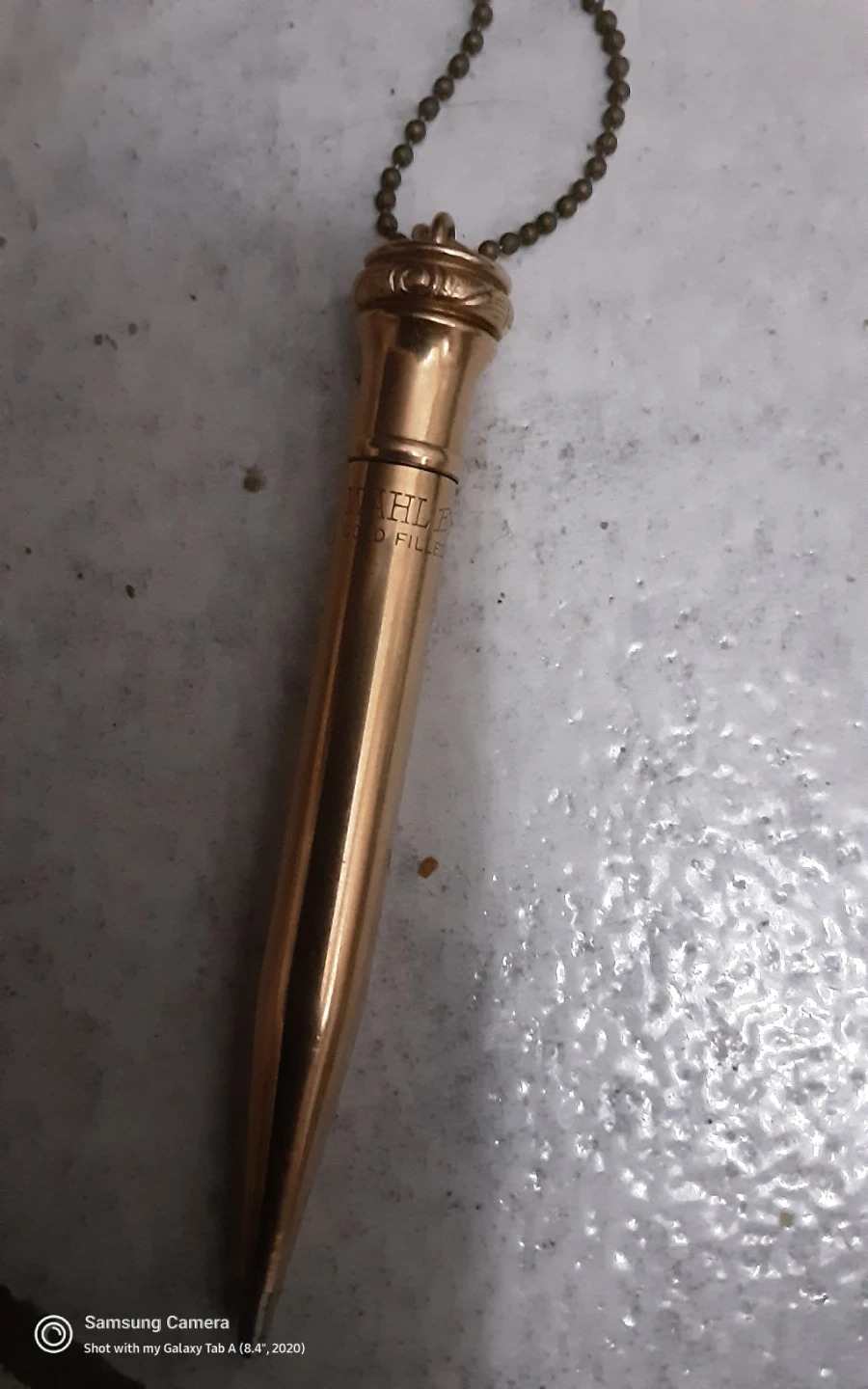 Here's a beautiful vintage mechanical pencil from the 1920s. It's gold filled and comes with a matching chain. The lead size is 1.1mm. This pencil is a neat piece of history!