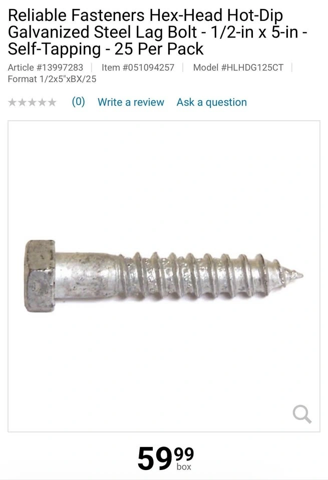 Hot Dipped Galvanized Lag Bolts (20 count) 5” x 1/2” — 1 box of 20. New Price per box - $50. Asking - $25.