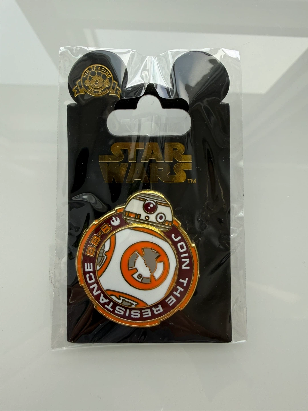 This is a Star Wars BB-8 pin featuring the 'Join The Resistance' slogan. It's designed in a circular emblem with BB-8 prominently displayed. Great for any Star Wars fan!