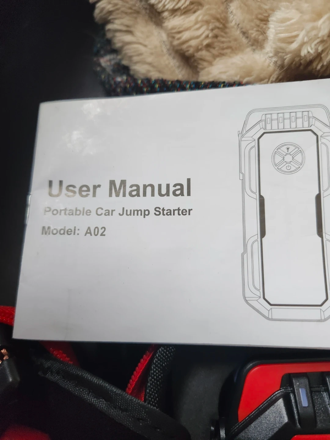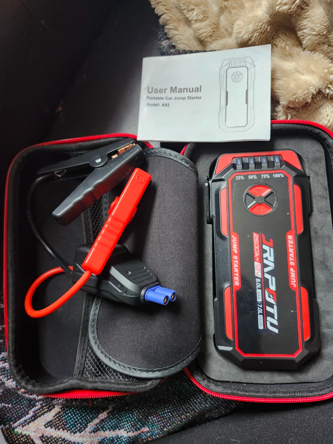 This is a RAPOTU portable car jump starter kit. It comes with jumper cables and a user manual. The unit displays battery percentage from 25% to 100%. It's useful for jump-starting a car battery.