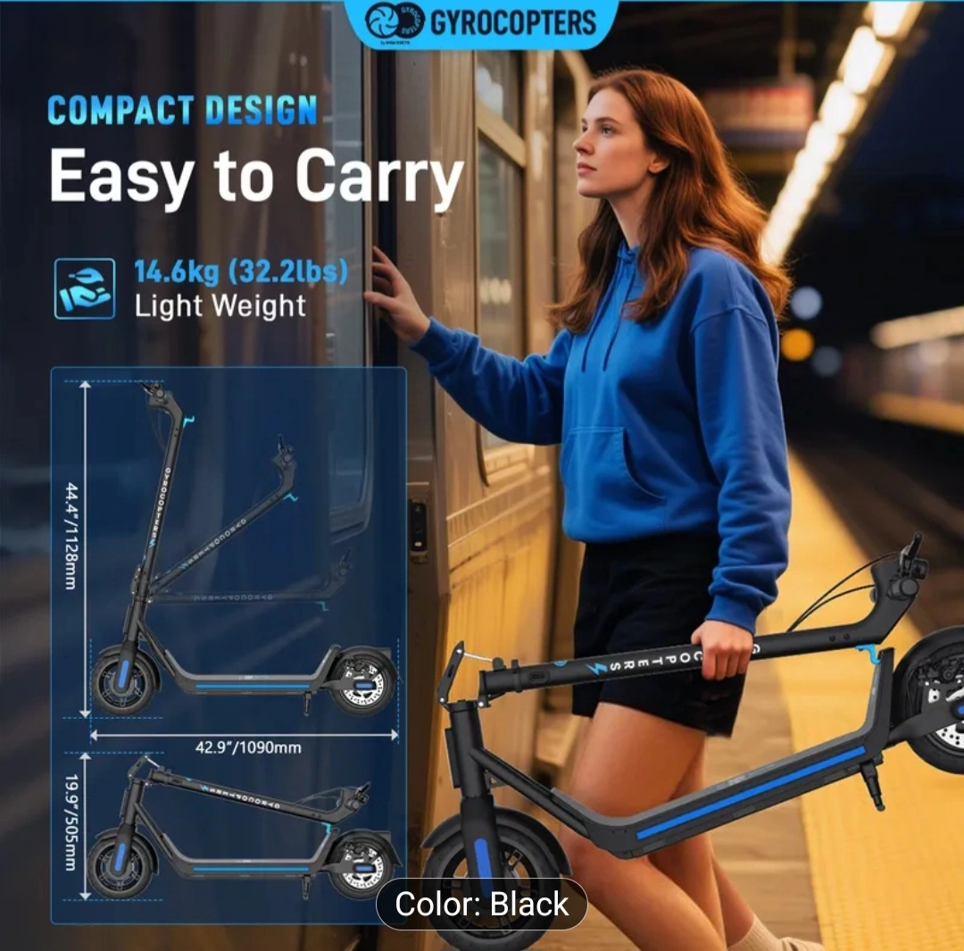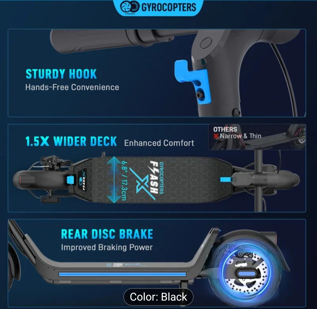 This black Gyrocopters FlashX electric scooter has a powerful 350W motor and 8.5" honeycomb tires for an all-terrain ride. It features front and rear fenders, an integrated taillight, and a rear disc brake for improved stopping power. The deck is 1.5x wider for enhanced comfort and measures 6.8"/17.3cm. It's lightweight at 14.6kg (32.2lbs) and has a compact design for easy carrying. This scooter is suitable for commuting on various surfaces like flat roads, gravel paths, and even beaches.