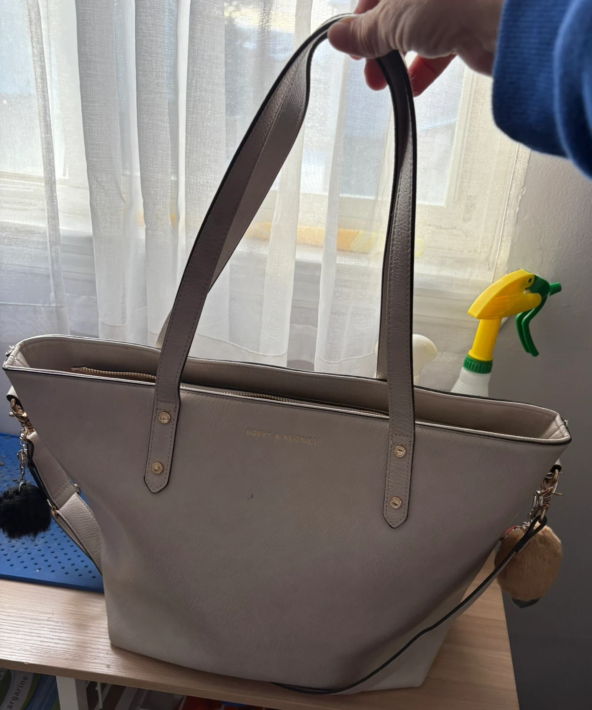 It is crafted in vegan leather, with an interior lining made from recycled plastic bottles. Dimensions are 19” L x 13” H x 8” W. Strap Drop Length: 11"