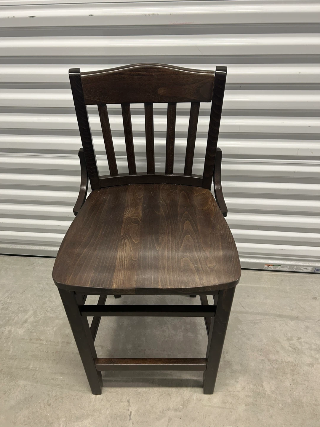 Dark brown wooden bar stool with a slatted back and contoured seat. It's made of solid wood. This stool would work well for a kitchen island or a home bar.