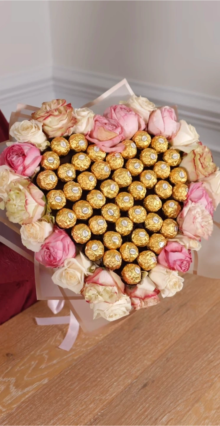 A beautiful heart-shaped bouquet featuring Ferrero Rocher chocolates and pink and white roses. It's a lovely gift for any special occasion. Makes for a sweet surprise!