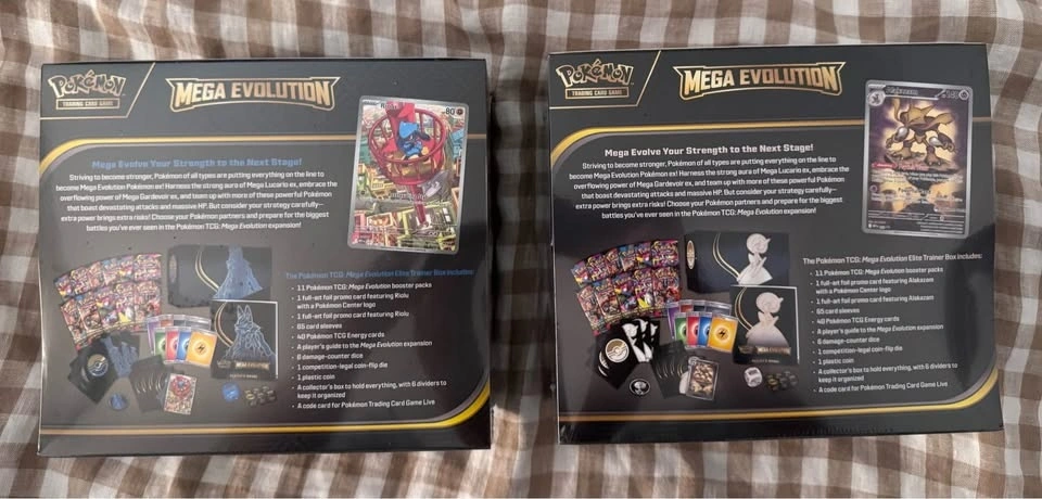 All brand new, factory sealed. Includes (1) Mega Evolution Pokemon Center Elite Trainer Box - Mega Lucario and (1) Mega Evolution Pokemon Center Elite Trainer Box - Mega Gardevoir. Pickup in Park Slope.