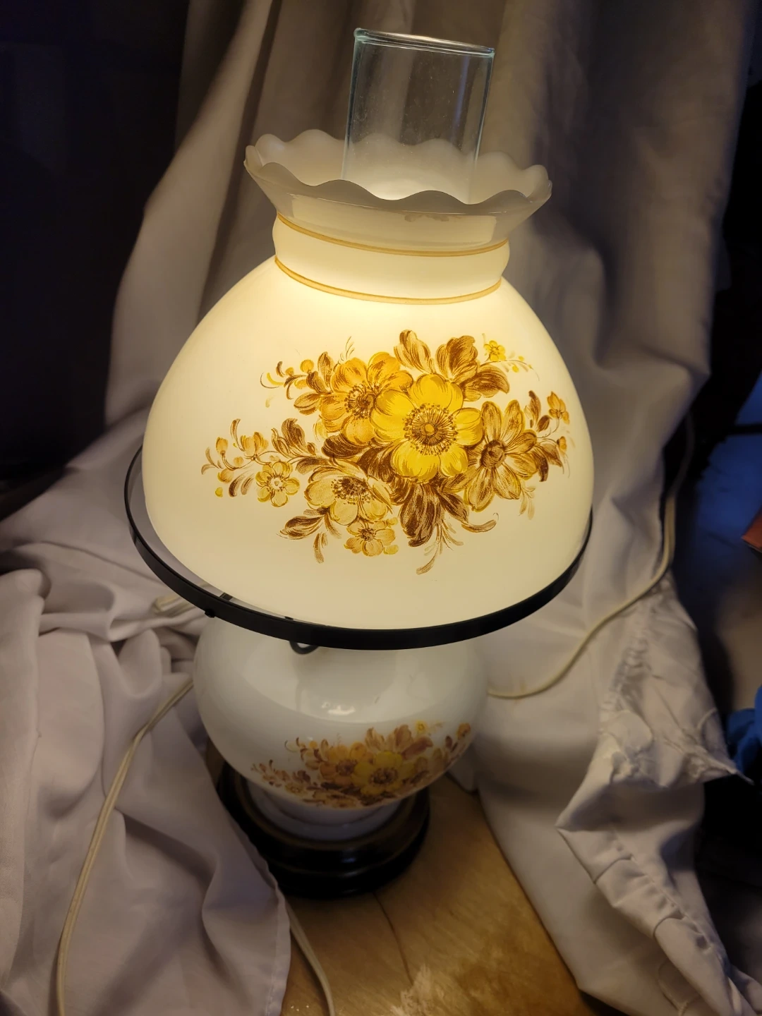 This vintage table lamp features a white glass shade adorned with a yellow floral design. It has a white glass base, also with a working light! with matching floral accents. Includes a clear glass chimney and a CFL bulb. Perfect for adding a touch of retro charm to any room!