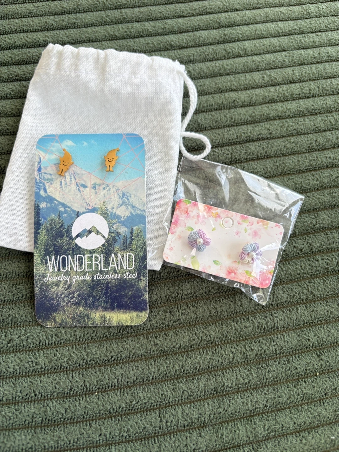These cute Wonderland earrings feature adorable gnome studs and delicate floral designs. They're made from jewelry-grade stainless steel. This set includes a drawstring pouch for storage.