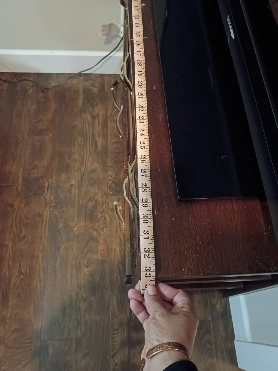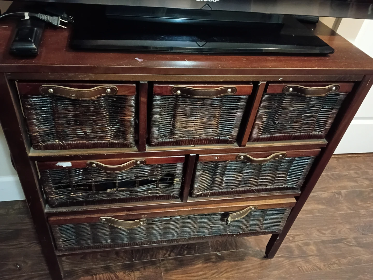 A dark wood storage cabinet featuring six wicker baskets. It's about 33 inches tall. Two of the top baskets have some damage, but most are still functional for storage.