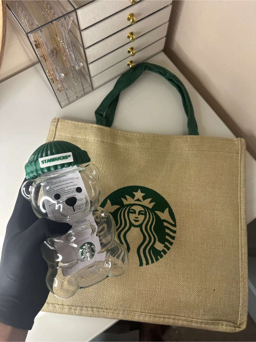 This is a clear Starbucks tumbler shaped like a bear. It comes with a green lid and a straw. A beige canvas tote bag with the Starbucks logo is also included. It's a fun collectible item from Starbucks!