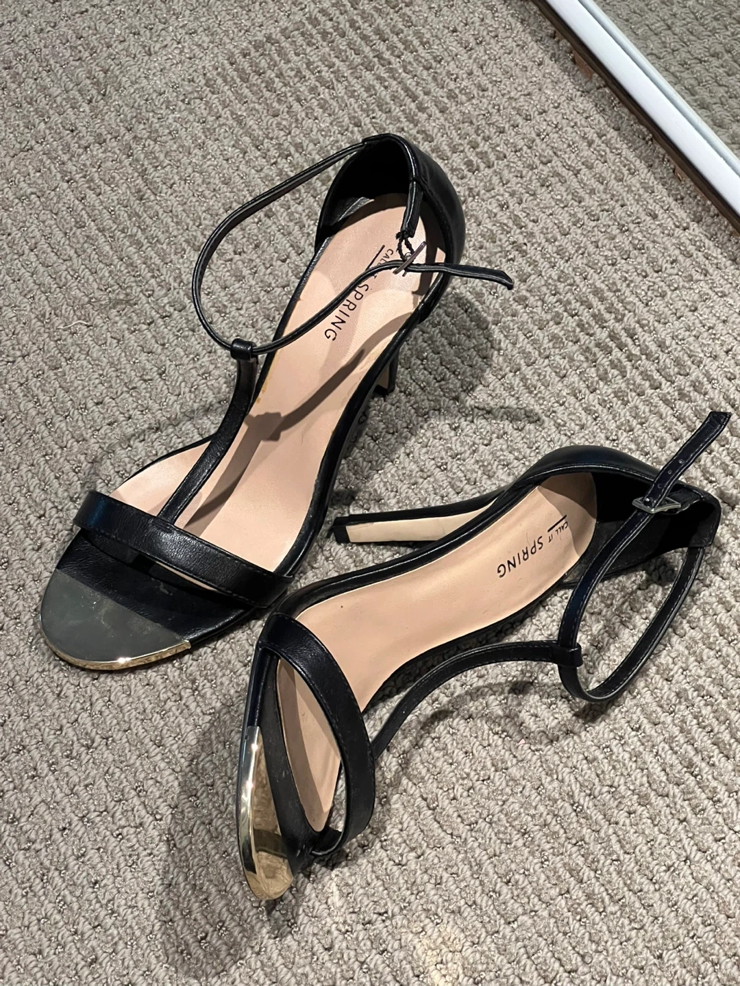 Selling a pair of Call It Spring black heels. They have a T-strap design and a gold accent on the toe. Have only worn twice. Size 8.5