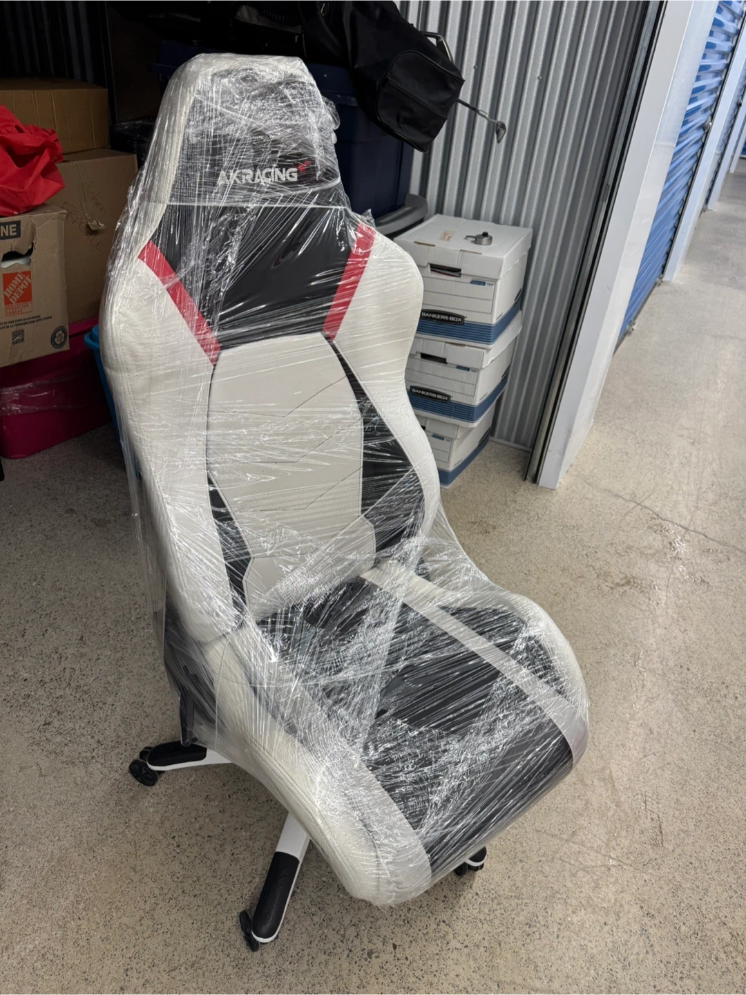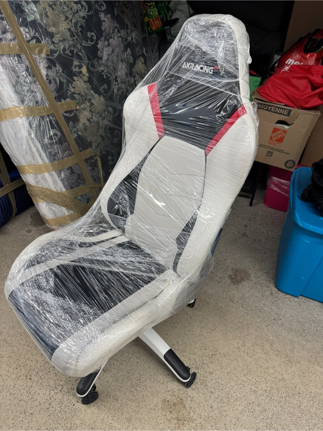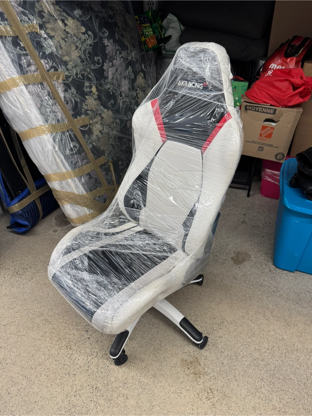 This AKRacing gaming chair is designed for comfort. It's upholstered in a mix of white, black, and red. Perfect for long gaming sessions or as an office chair. Wrapped up in plastic from move so material will be protected during transport. Pickup only.