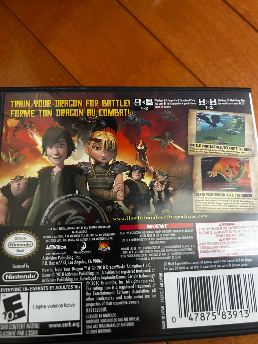 This is the How to Train Your Dragon game for the Nintendo DS. It's rated E10+ by ESRB. It's compatible with the DS and DSi systems.