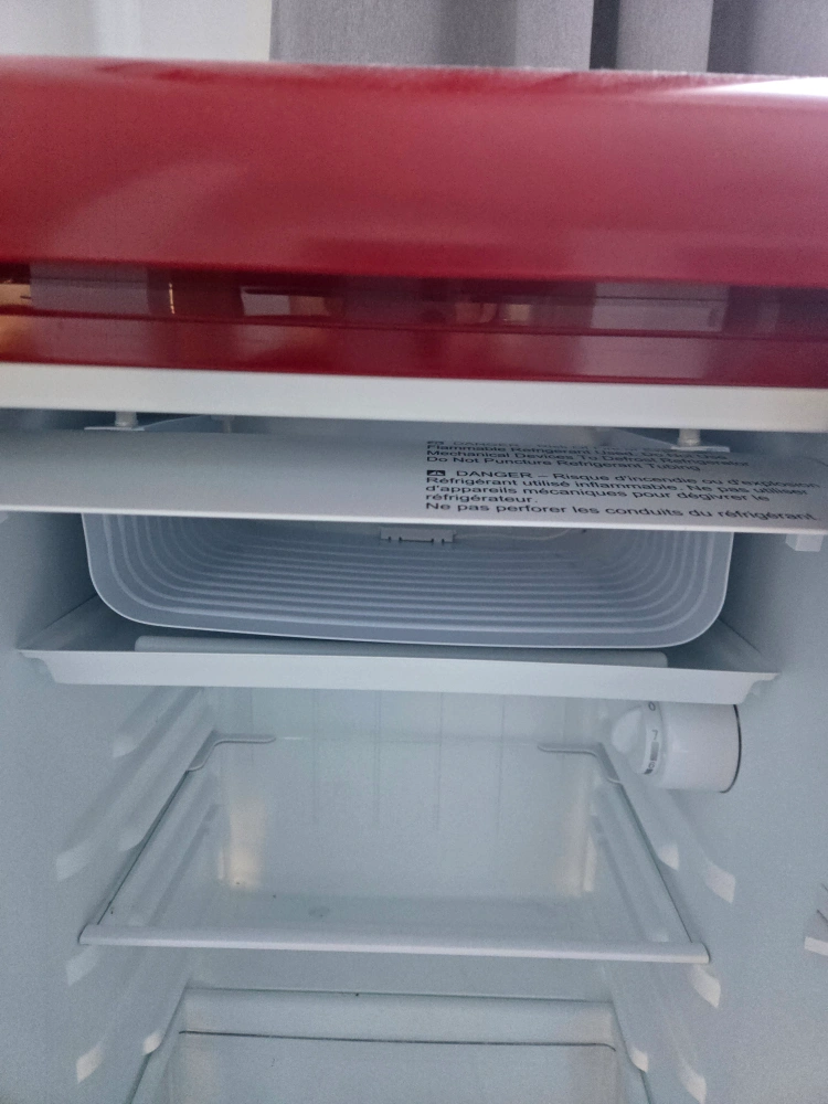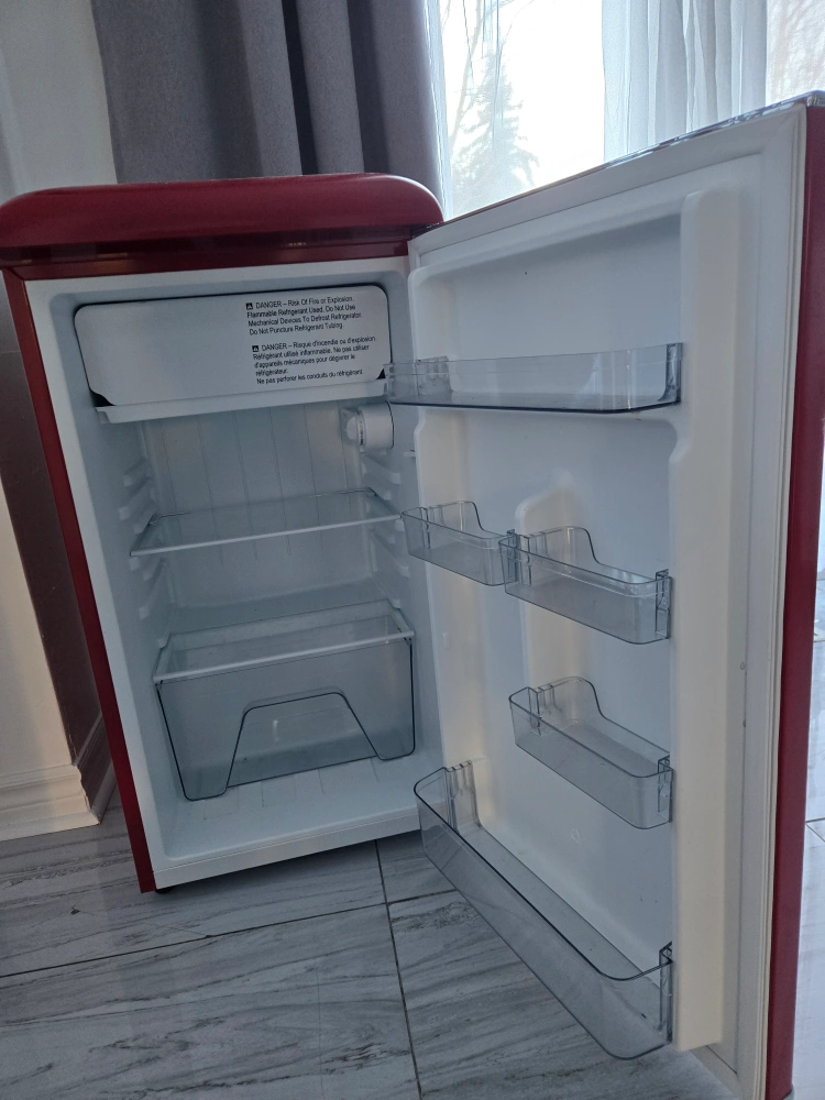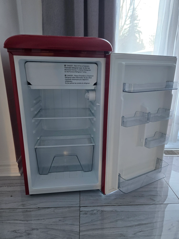 Small red refrigerator. Compact design. Ideal for dorm rooms or small spaces. Includes shelves and crisper drawers. Free-standing installation only.