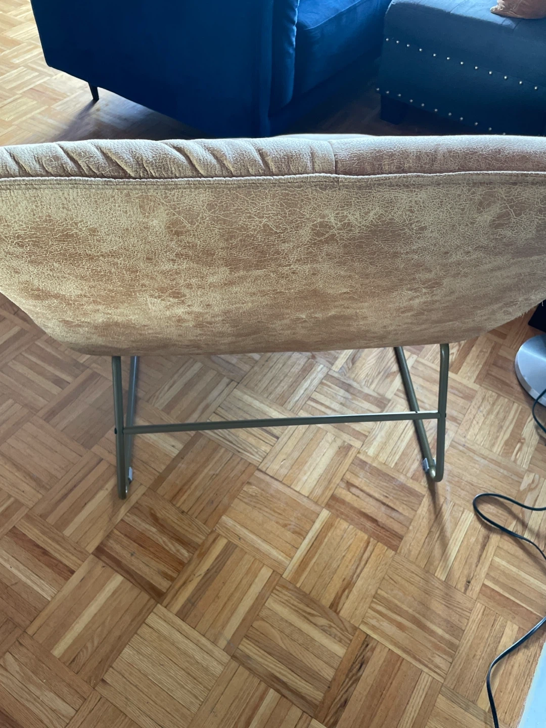 This accent chair features a tan, distressed upholstered seat and back with a tufted design.