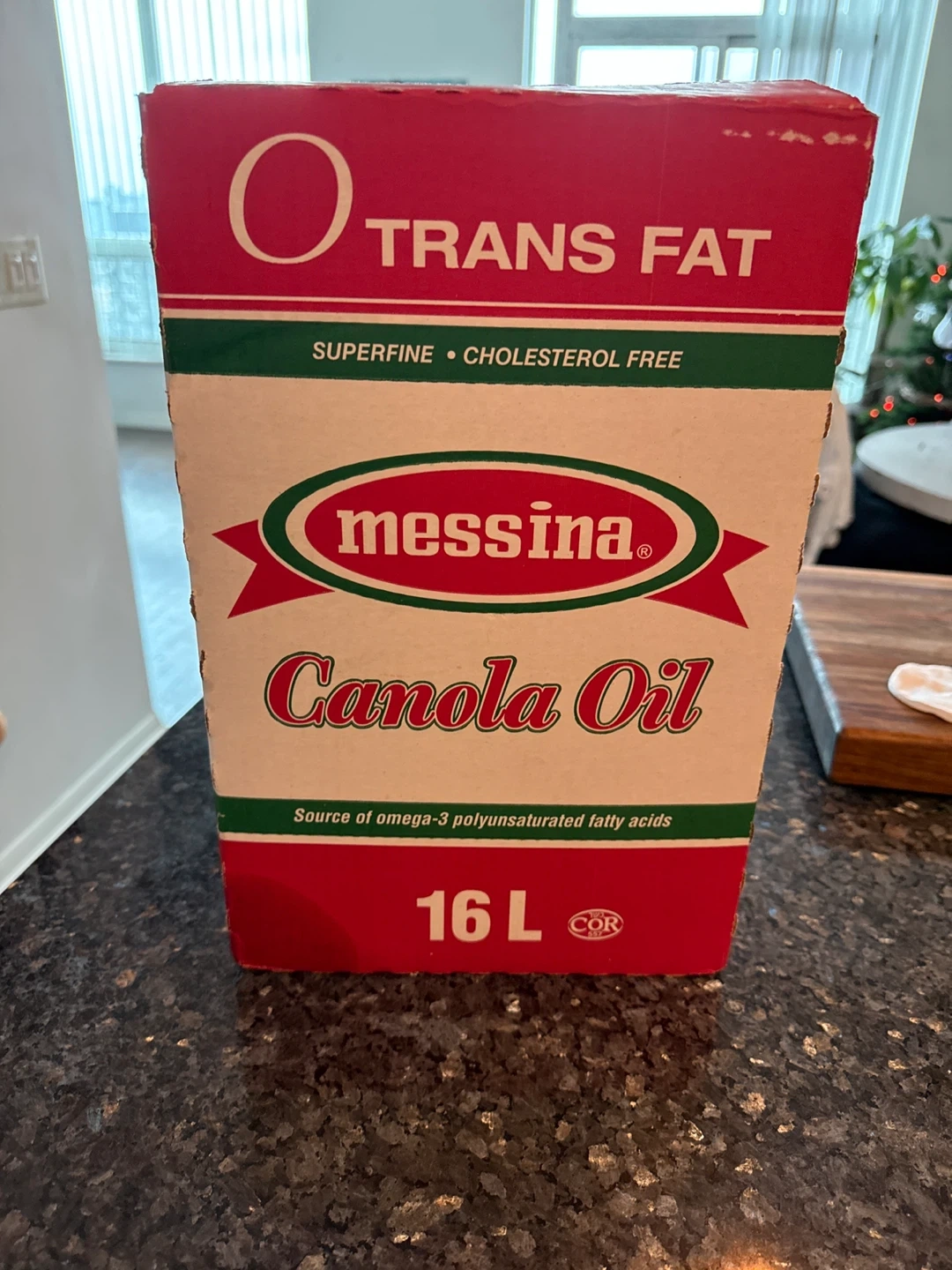 Bought and used a few litres. At least 12 litres left. box of Messina Canola Oil. It's superfine and cholesterol-free, and a source of omega-3 polyunsaturated fatty acids