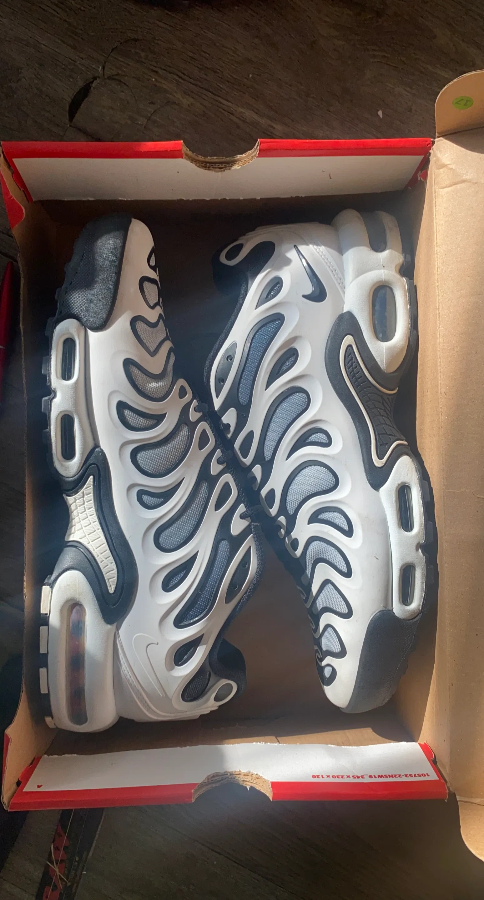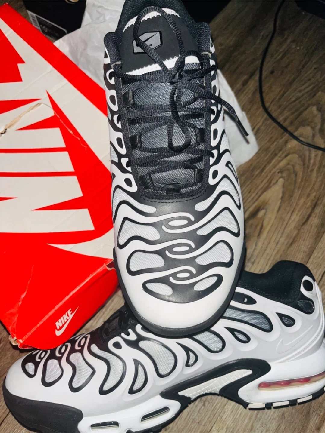 Classic Nike Air Max Plus TN SE running shoes. Features a bold white and black wavy design. Includes original box and Nike Air cushioning for comfort. Great for everyday wear or athletic activities!