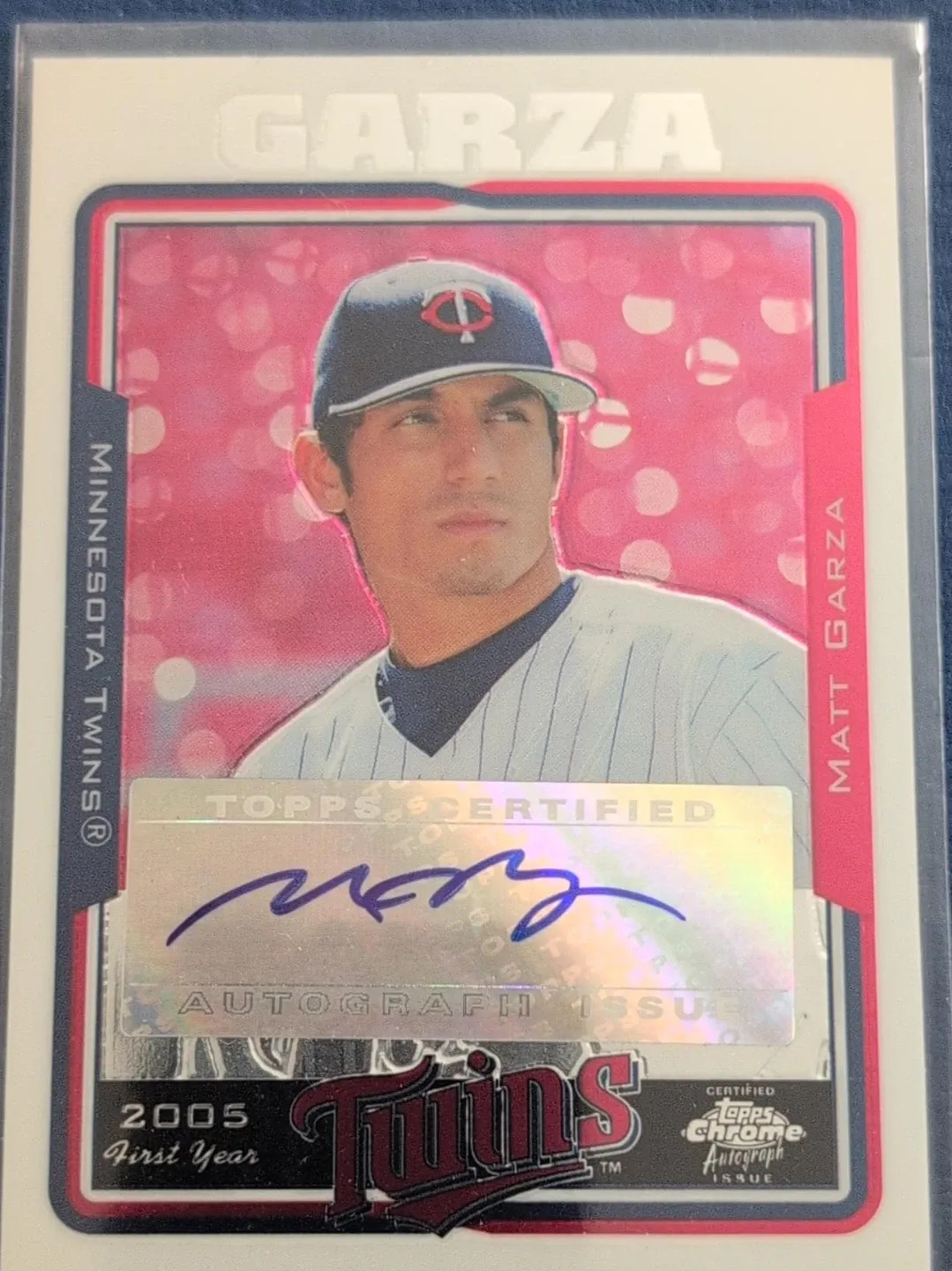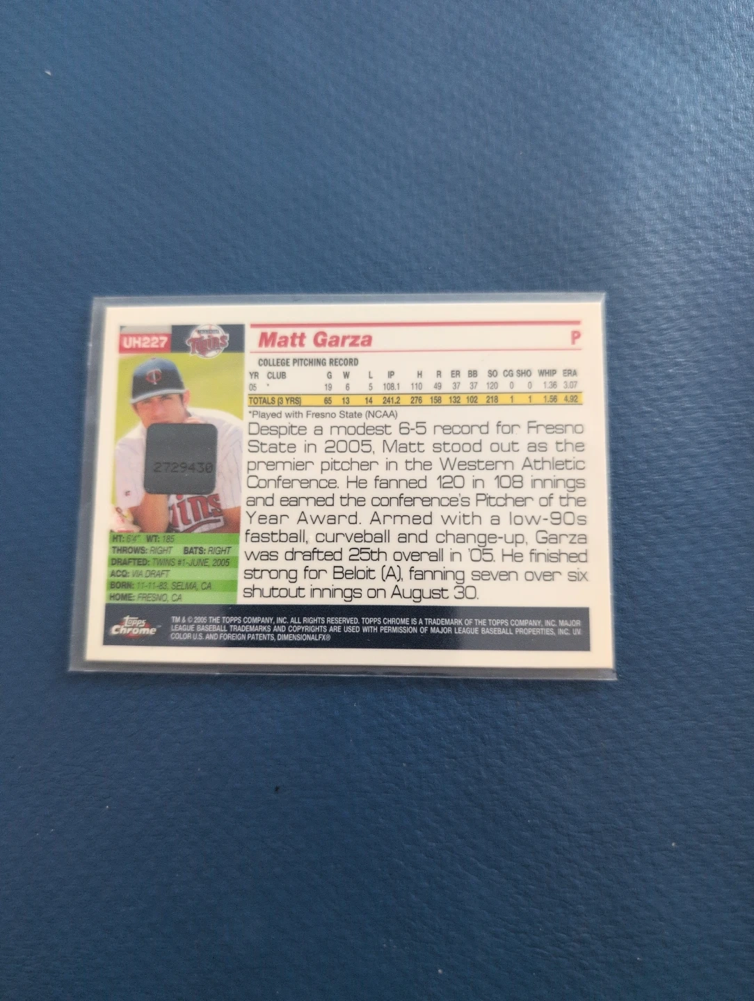 This is a 2005 Topps Certified Autograph baseball card for Matt Garza. It features his signature and is part of the Chrome line. The card details his college and pro playing stats. It's from his rookie season in 2005.