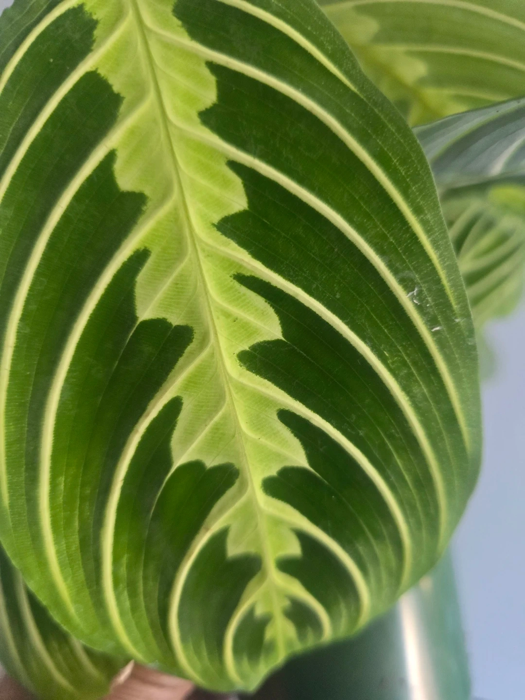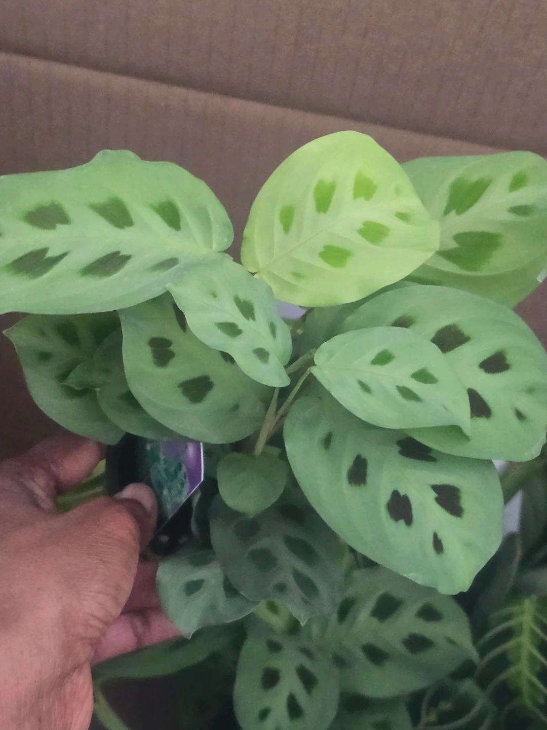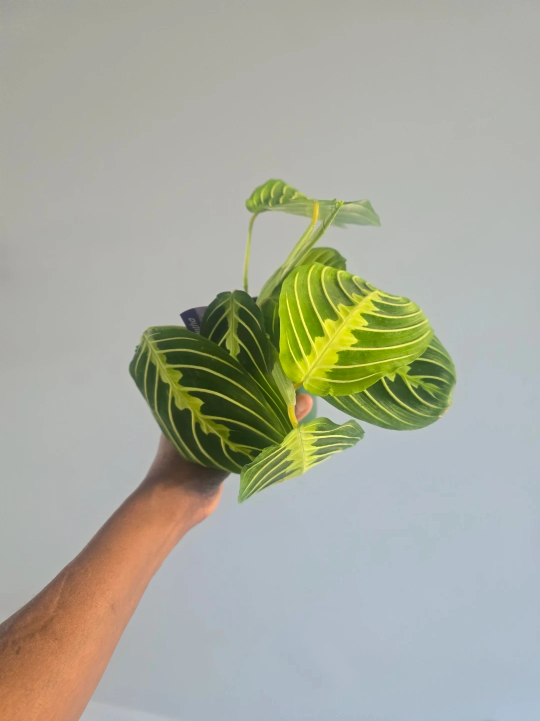 This is a live Lemon-Lime Prayer Plant. It's potted in a green plastic container with soil. The plant features striking green leaves with yellow-lime variegation.
