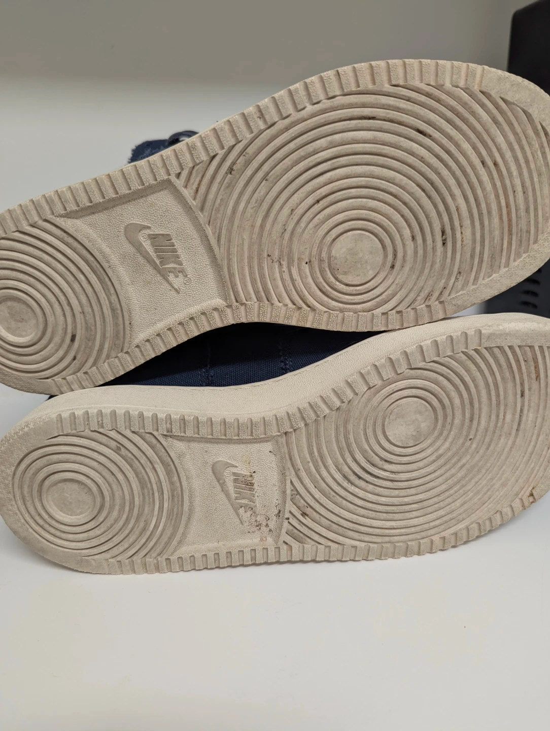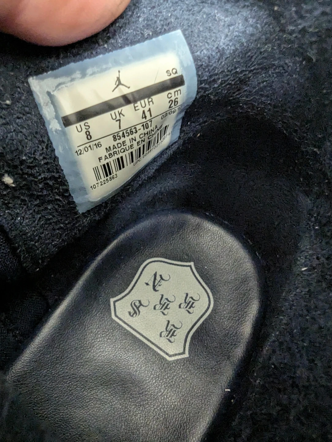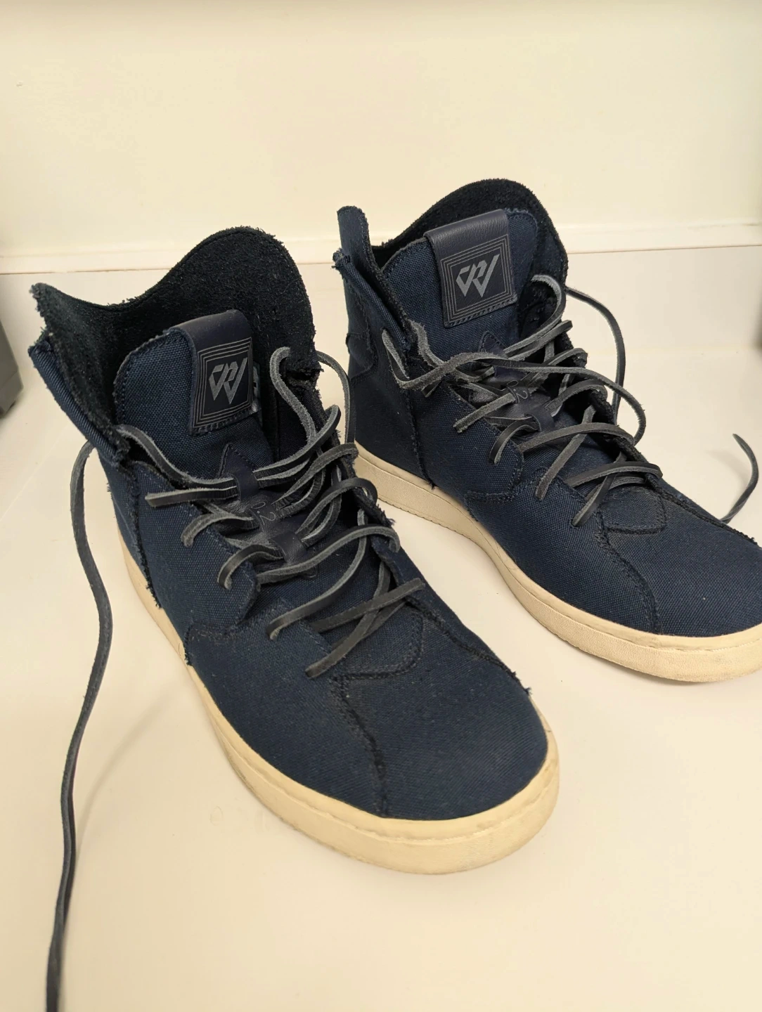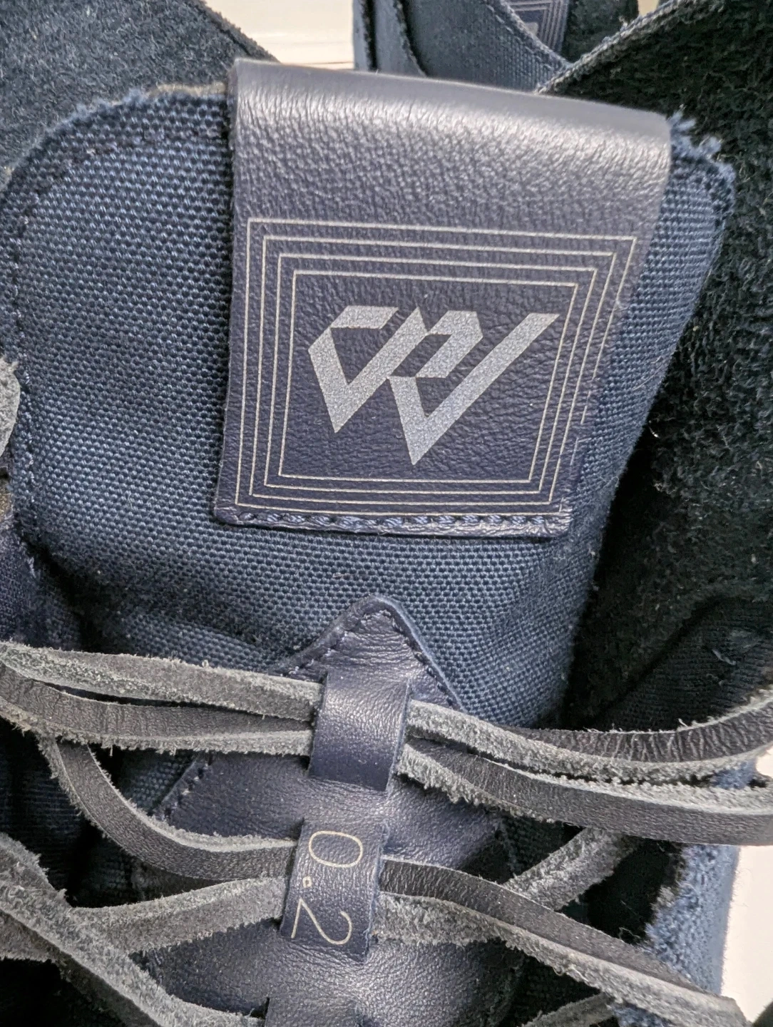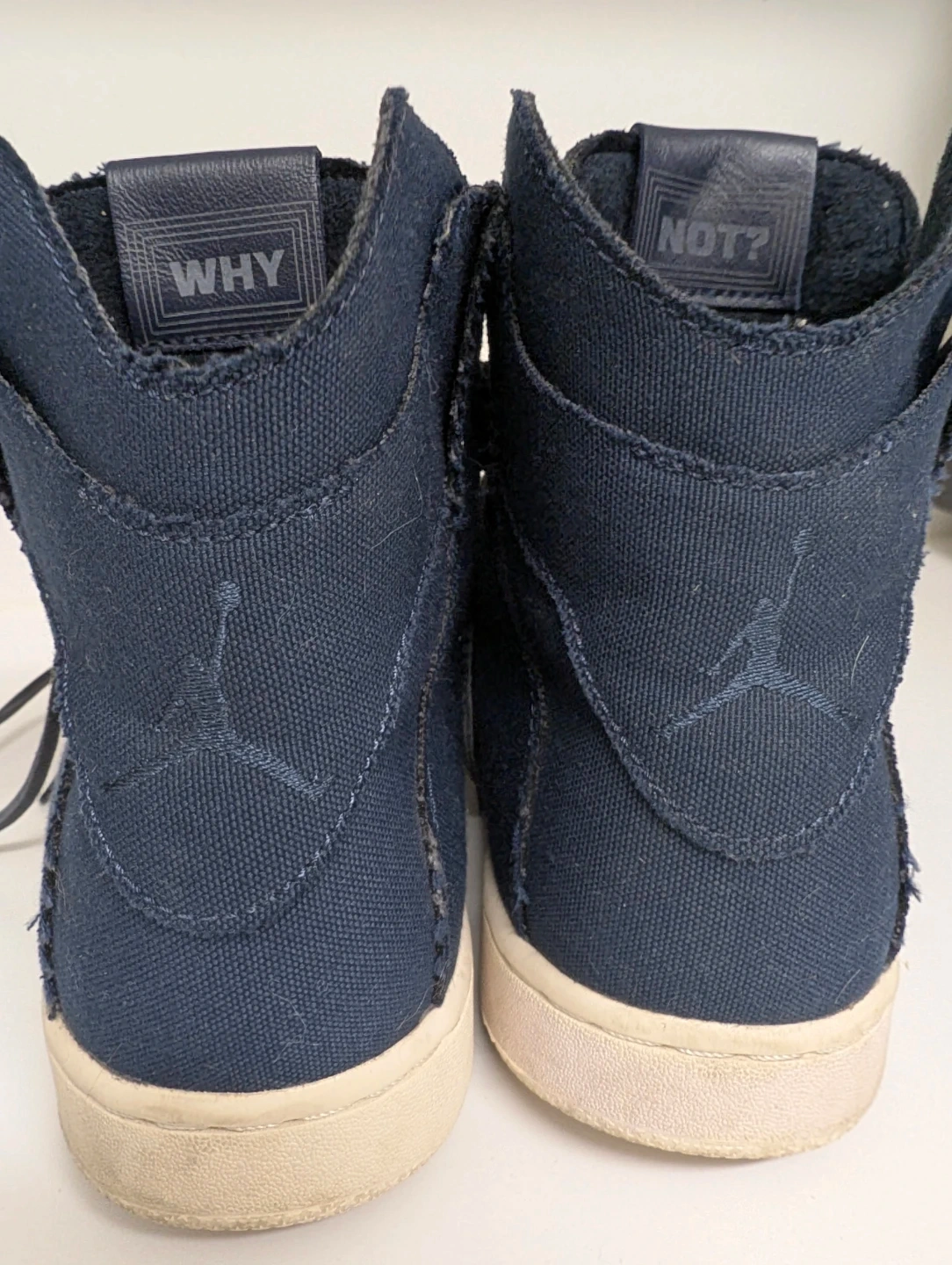 These Nike Air Jordan Westbrook 0.2 sneakers come in a navy blue canvas with leather accents. It's a mid-top design with a secure lace-up closure. US size 8, UK 7, EUR 41, CM 26.