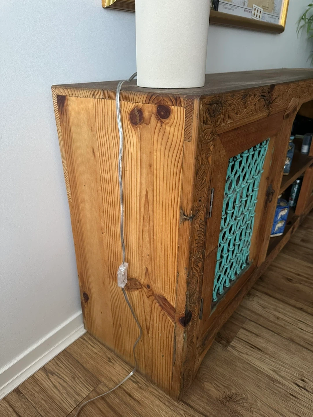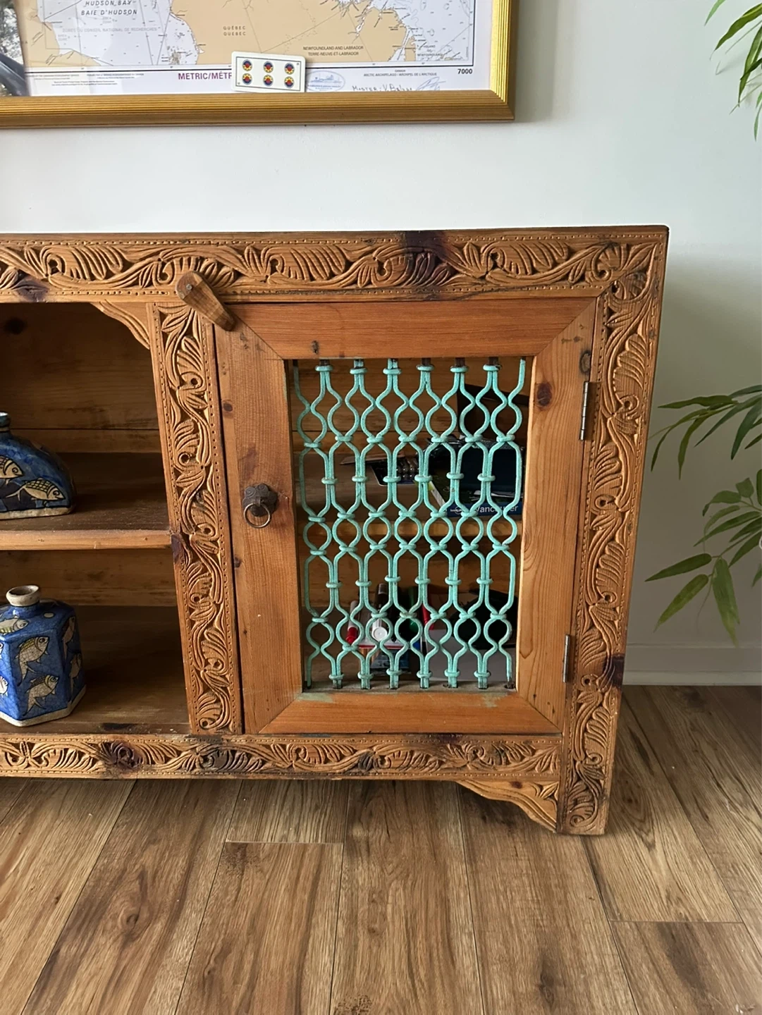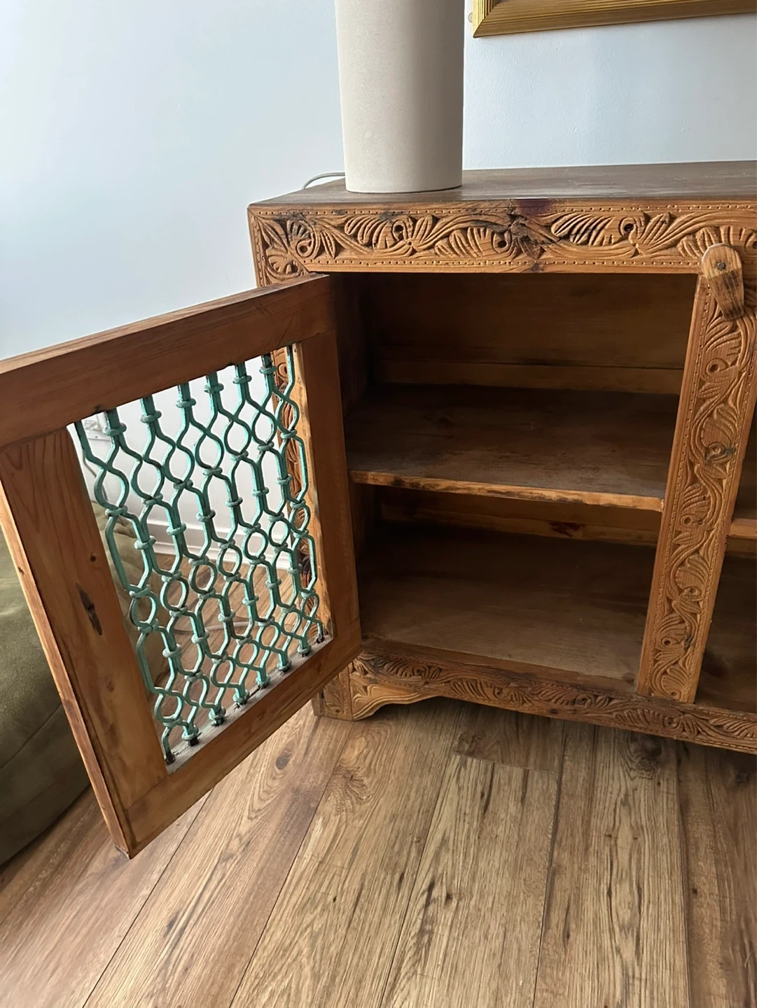 Bring character and charm to your home with this one-of-a-kind carved wooden sideboard. Handmade in Pakistan with intricate detailing and turquoise metal lattice doors, it’s both decorative and functional. Solid wood with beautiful hand-carved patterns. Two lattice doors plus open shelving for versatile storage. Rustic, bohemian style – each imperfection adds character.