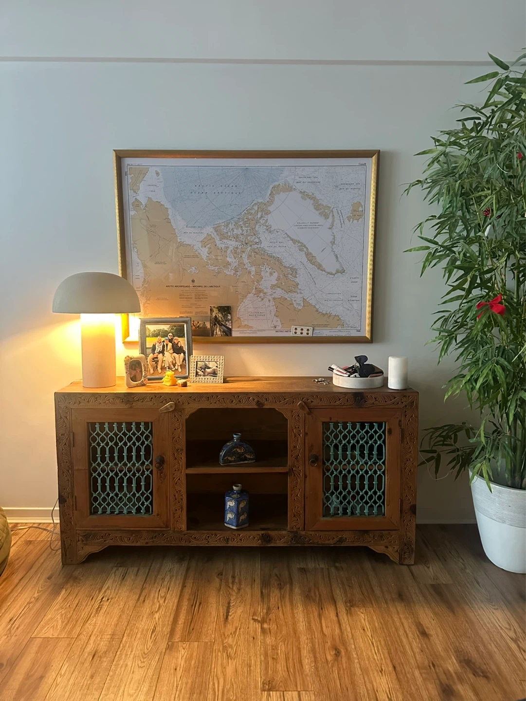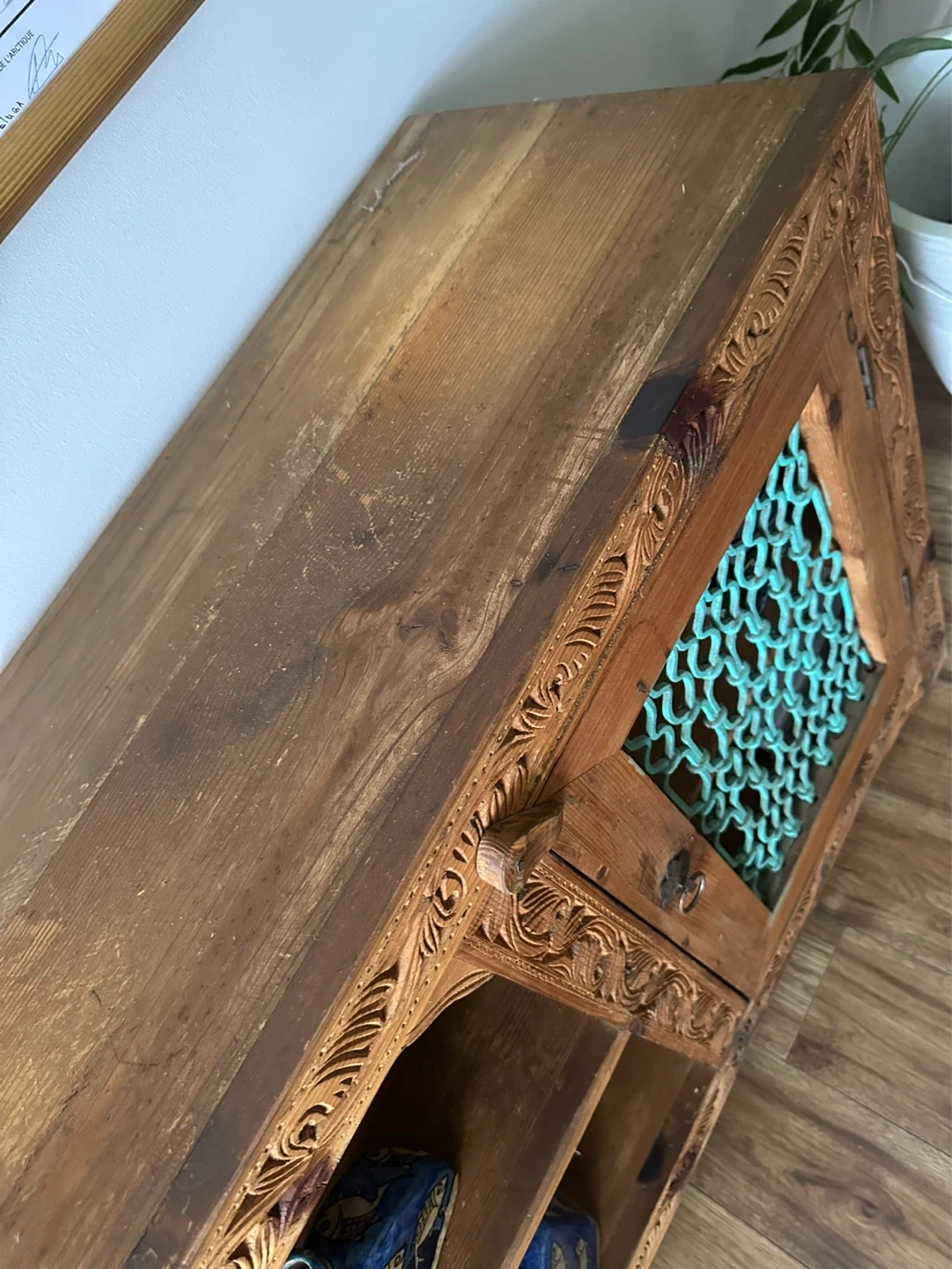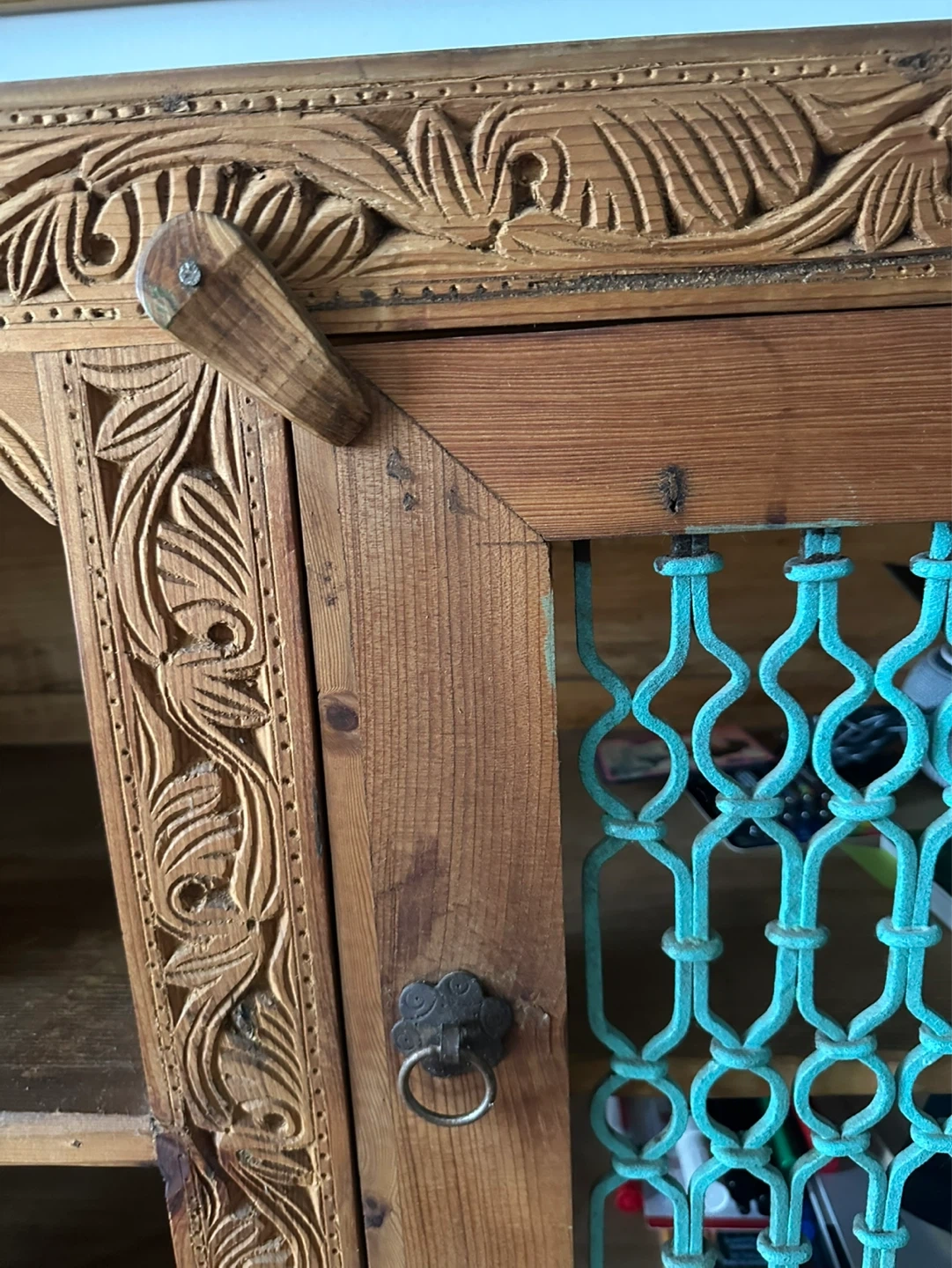 Bring character and charm to your home with this one-of-a-kind carved wooden sideboard. Handmade in Pakistan with intricate detailing and turquoise metal lattice doors, it’s both decorative and functional. Solid wood with beautiful hand-carved patterns. Two lattice doors plus open shelving for versatile storage. Rustic, bohemian style – each imperfection adds character.