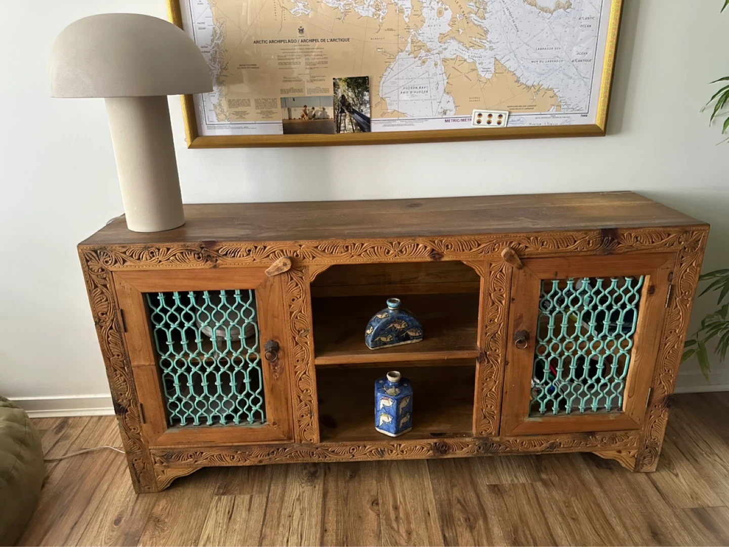 Vintage Carved Wood Sideboard with Teal Doors
