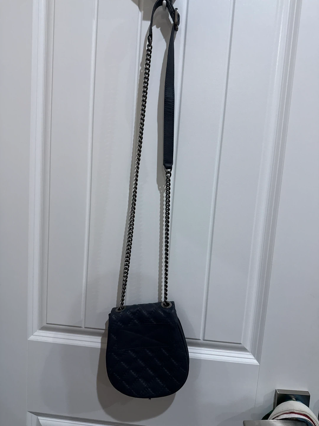 This stylish black crossbody bag features a quilted design and decorative tassels. It has a long silver chain strap, perfect for wearing over the shoulder or across the body. A great accessory for a night out!
