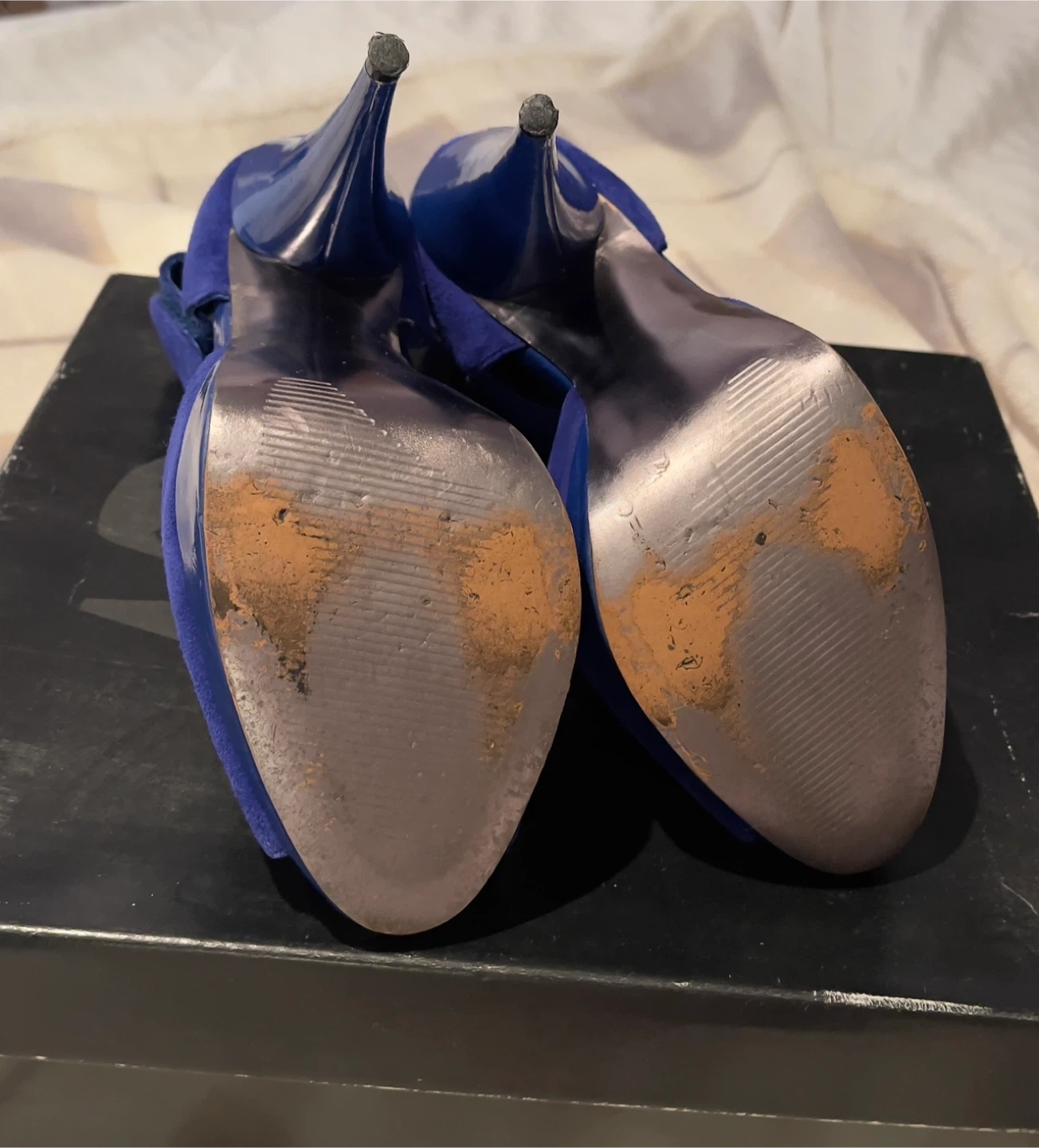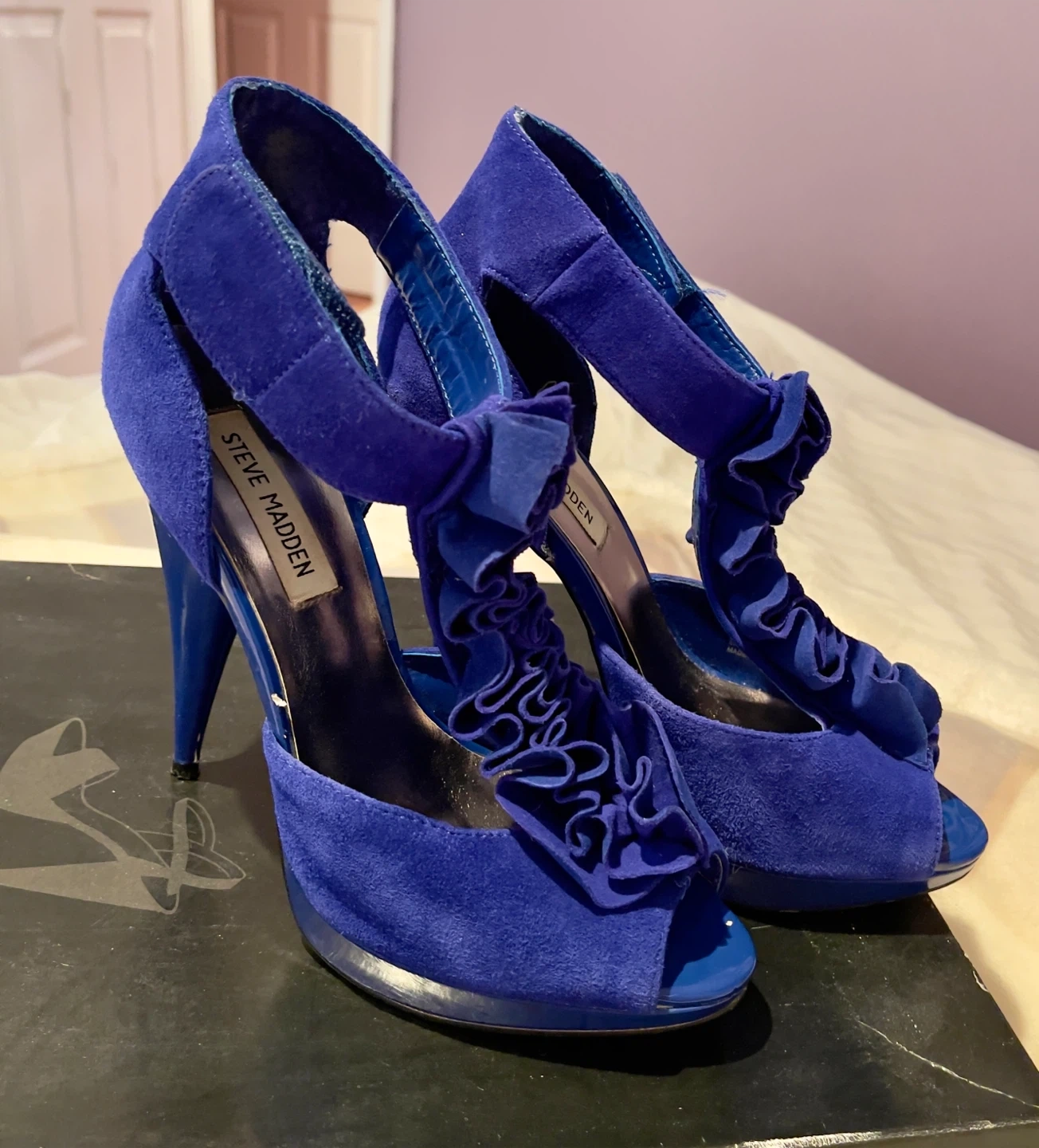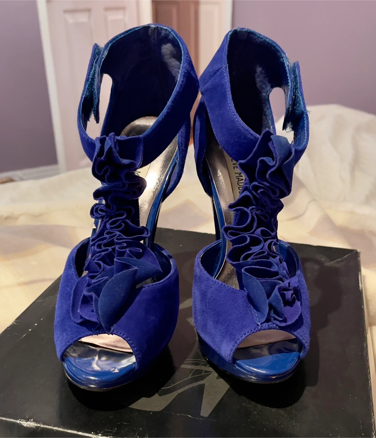 These Steve Madden heels are a vibrant blue and feature a cute ruffle detail. They are a size 8.5 and come with the original box. There are some signs of wear on the soles, but they're still ready for a night out!