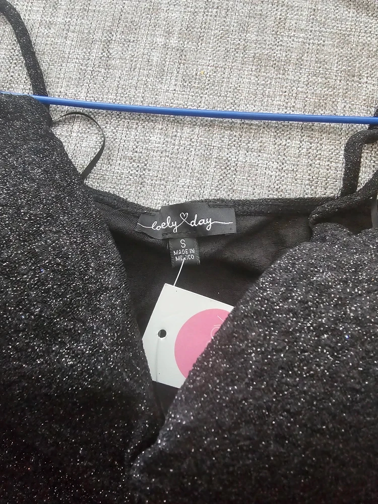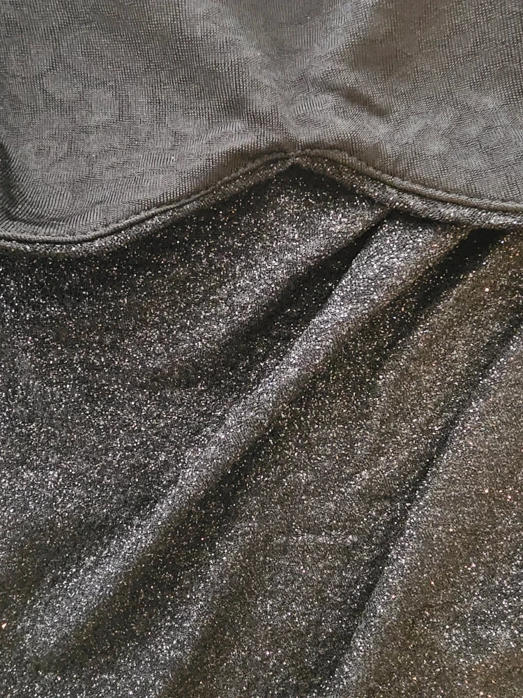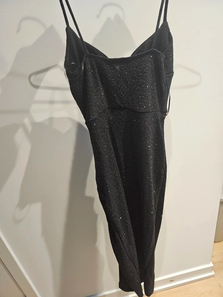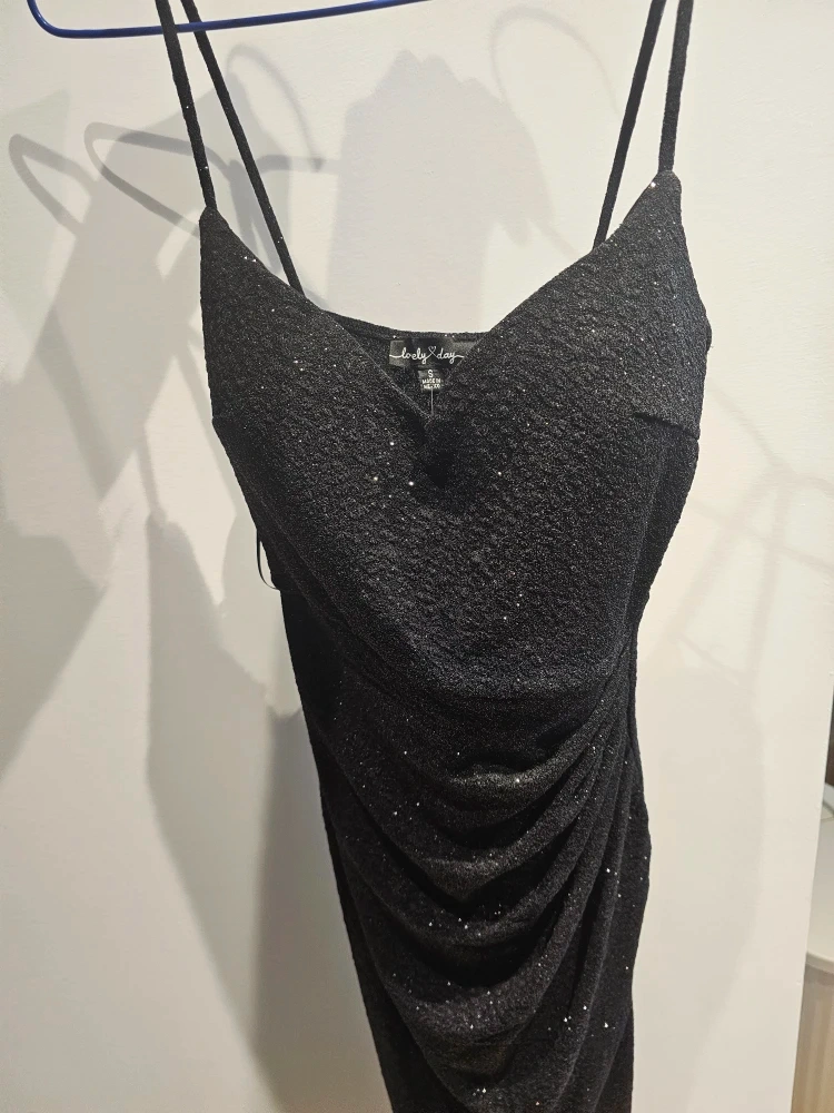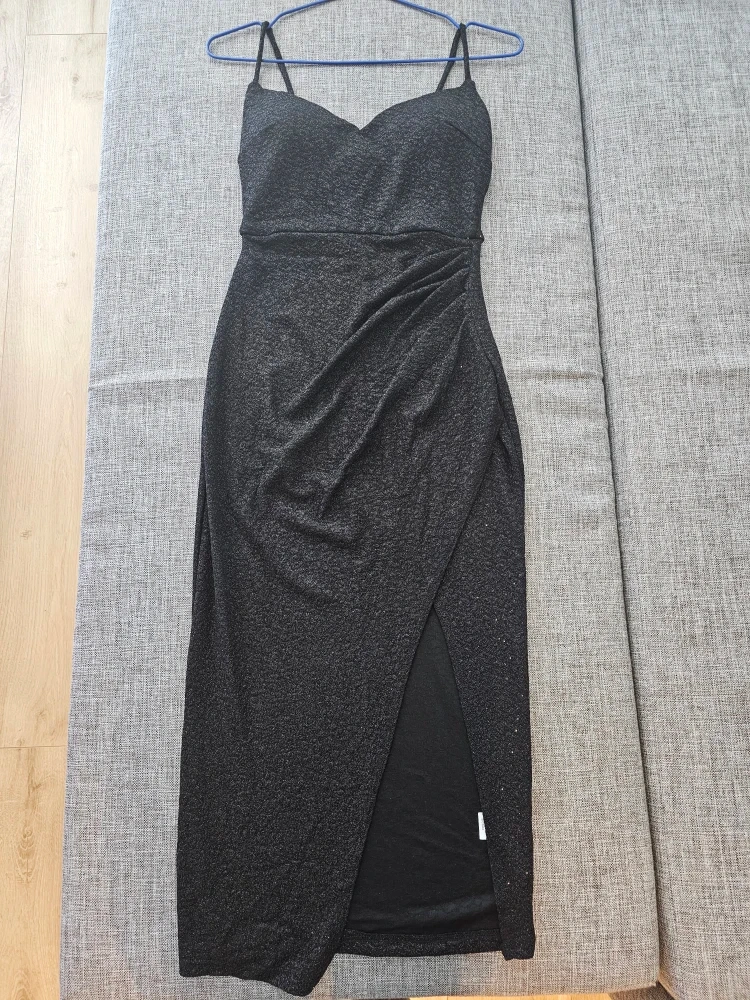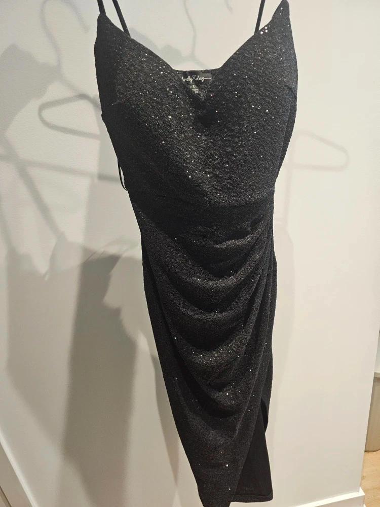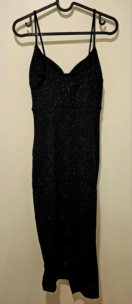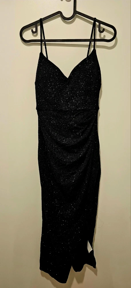 Lovely Day black sparkly midi dress. It's a size small with a ruched detail and a slit. Made in Mexico.