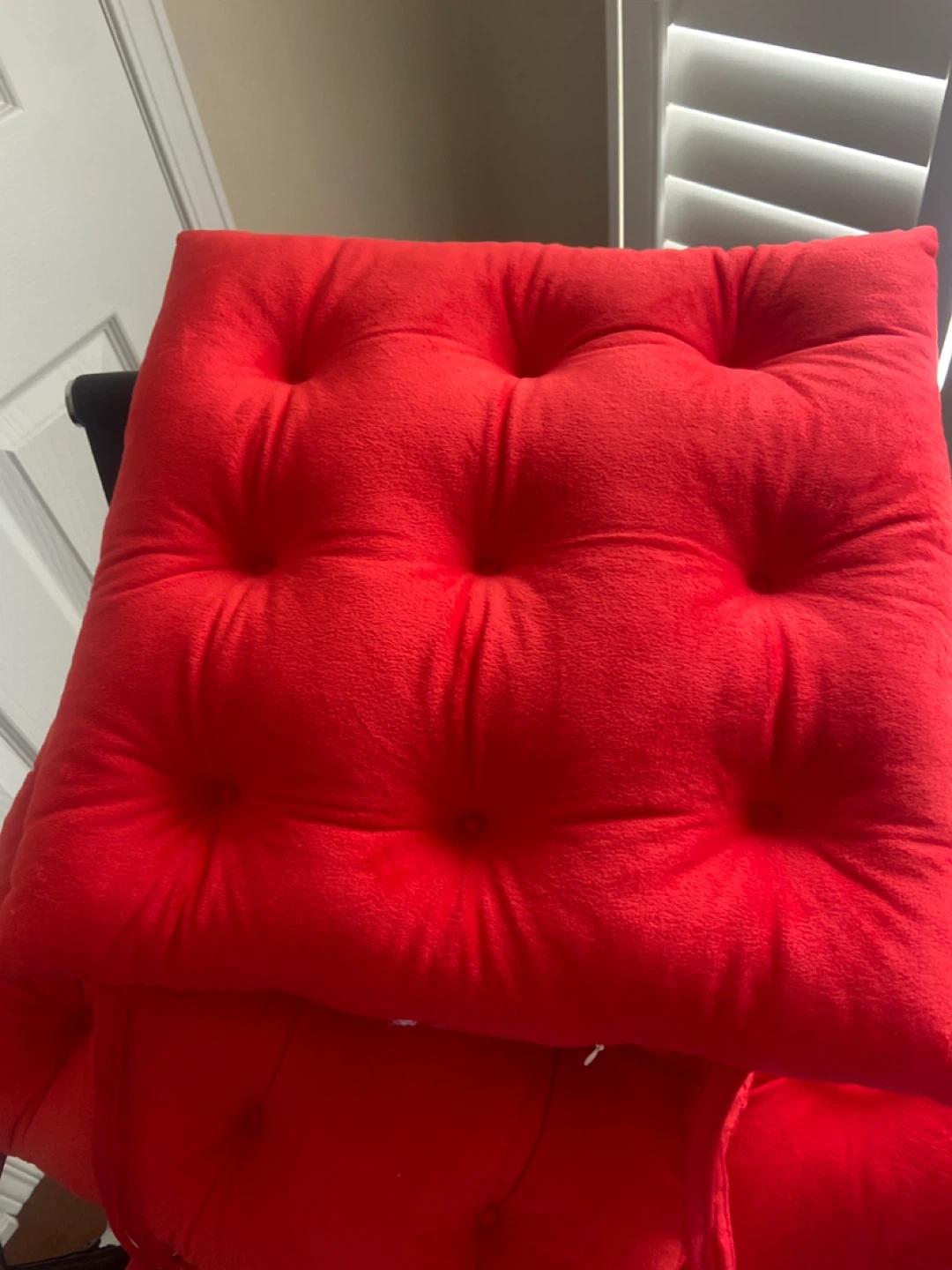 Set of five red tufted chair cushions. These soft cushions add comfort and style to any seating. They're perfect for dining chairs, office chairs, or patio furniture. Each cushion features a plush, tufted design with ties for secure placement.