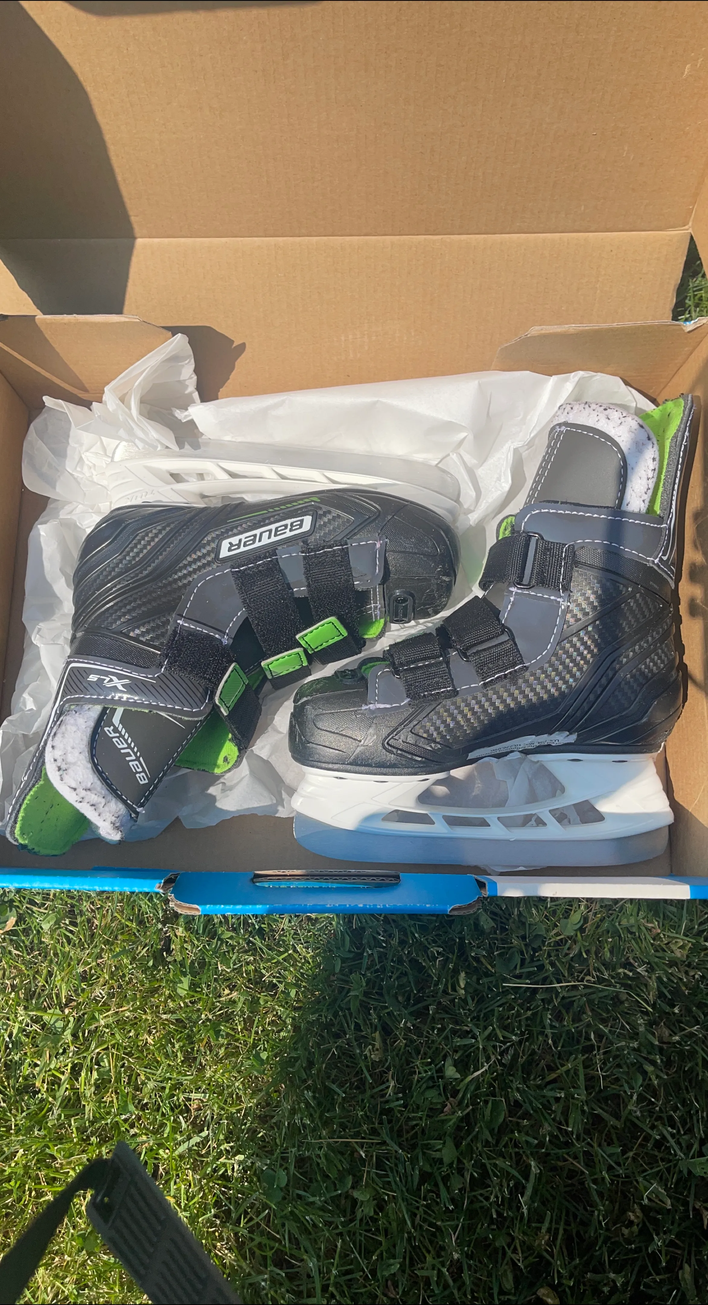 Bauer hockey skates with a black and green design. They come with straps for a secure fit. This pair is ready for the ice!
