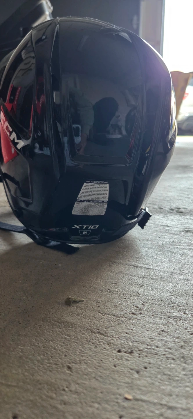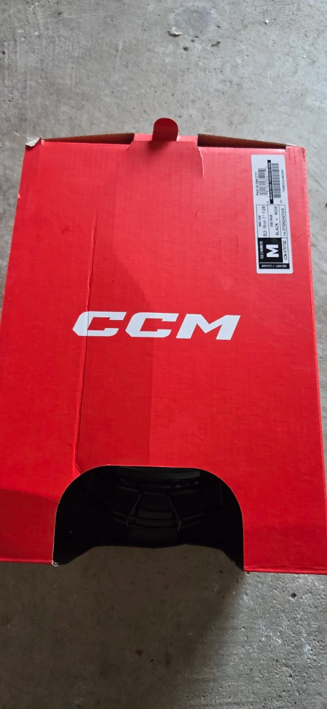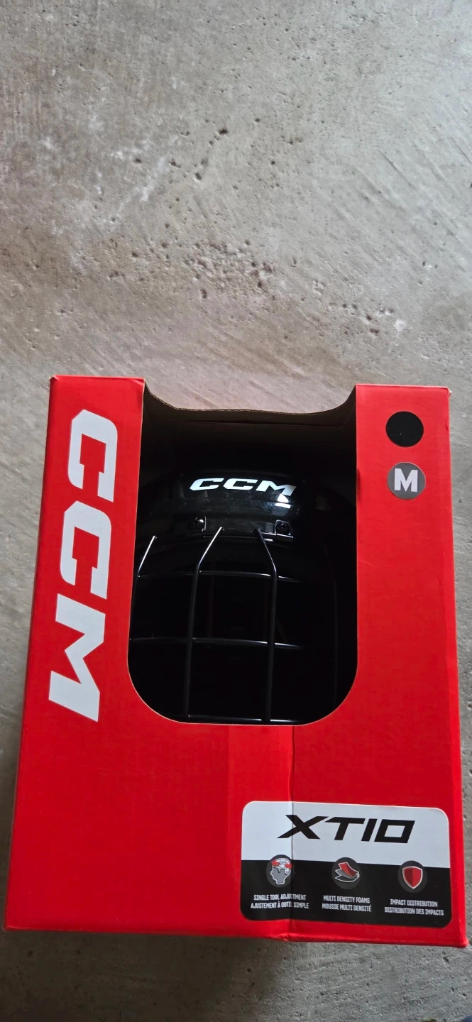 CCM XTIO hockey helmet in black. Size medium. Includes a cage for full facial protection. Original box is present. Age for 7-10