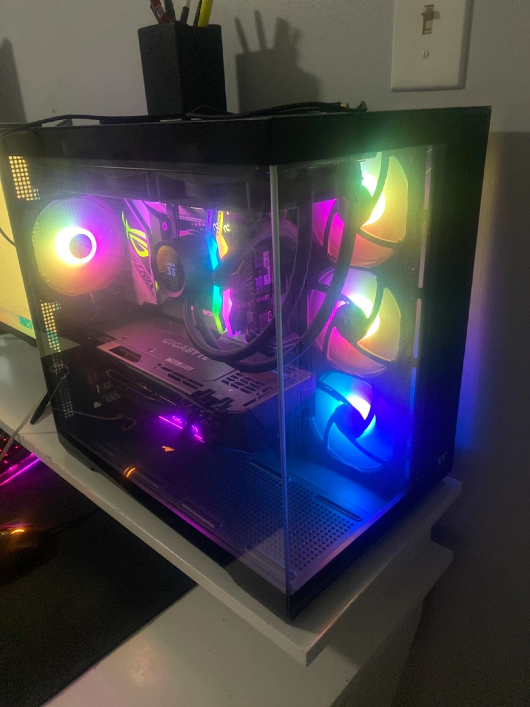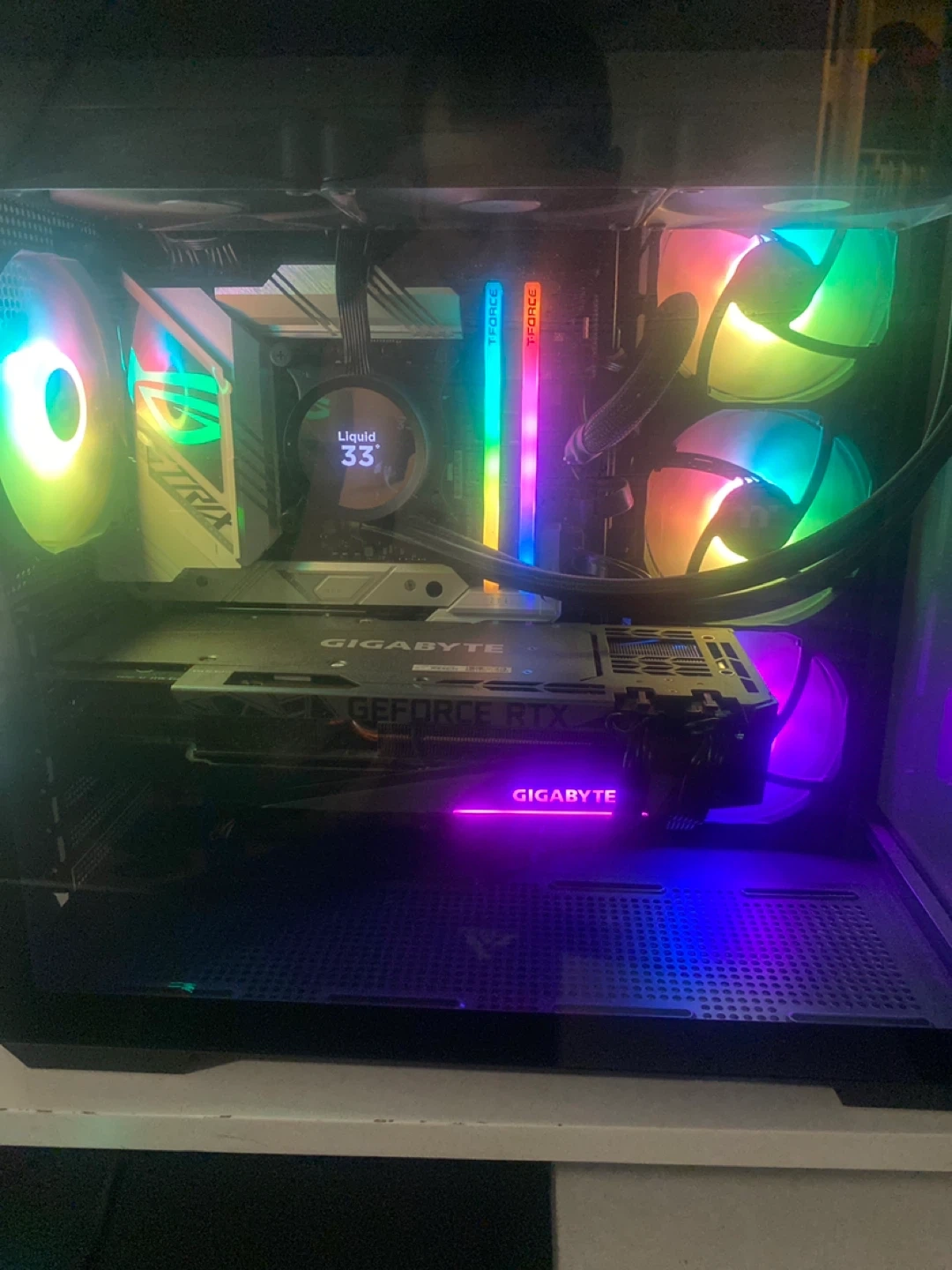This is a custom gaming PC. It features a Gigabyte 3080ti GeForce RTX graphics card and an ASUS ROG motherboard. Intel 14900k. The system is equipped with T-Force RAM and a liquid cooler, all housed in a case with vibrant RGB lighting. Ready for intense gaming sessions!