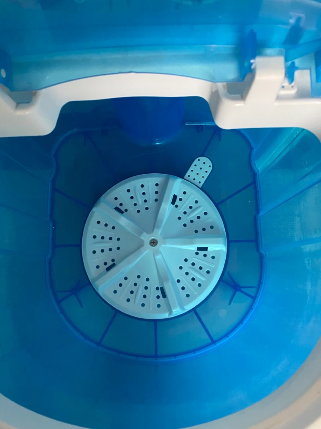 Compact blue and white portable washing machine. It's ideal for small loads or delicate items. Unit has two wash settings and a spin cycle for quick drying. Perfect for apartments or travel!