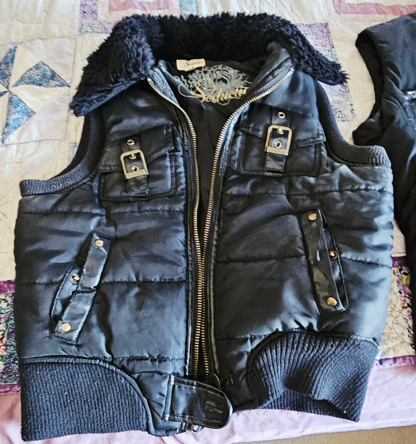 Two black puffer vests for women. One vest has a faux fur collar and buckle details. Both are size medium. These vests are perfect for layering on cooler days.