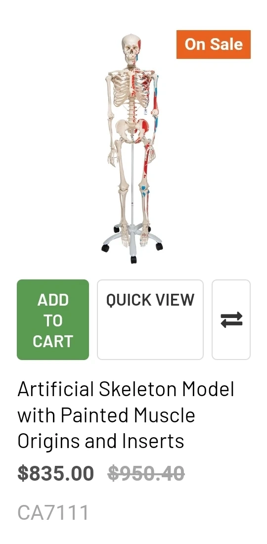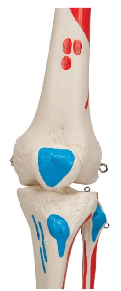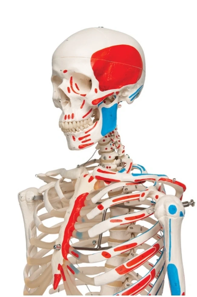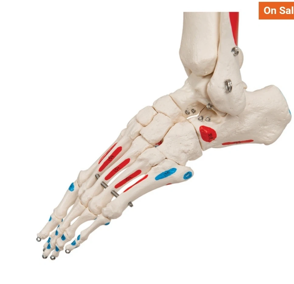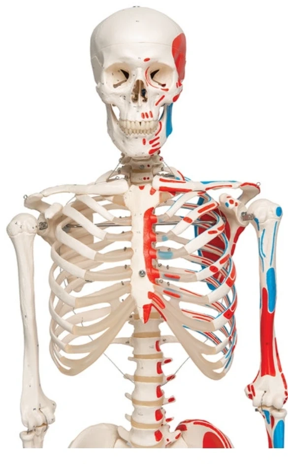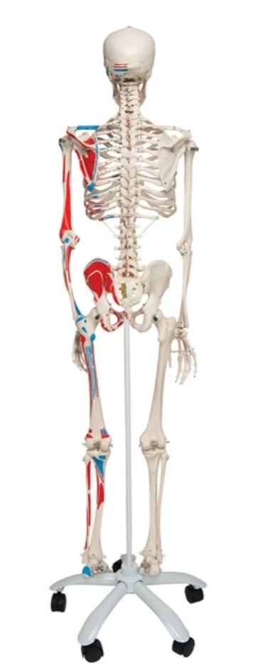 This is an anatomical model of the human skeleton, featuring coloured muscle origins and insertions. It's mounted on a stand with wheels for easy movement. The skeleton is a detailed representation for educational or display purposes.