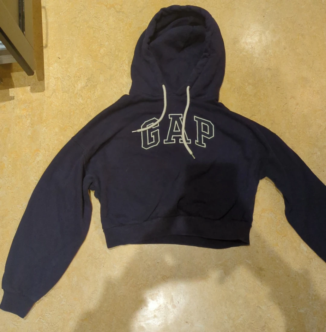 A navy blue cropped hoodie from GAP. It's a size XS. This hoodie features the classic GAP logo across the chest.